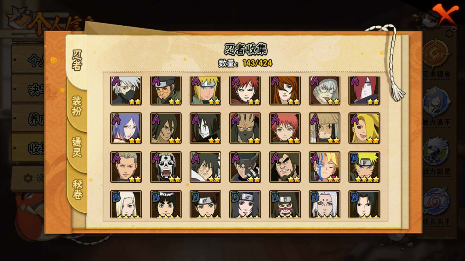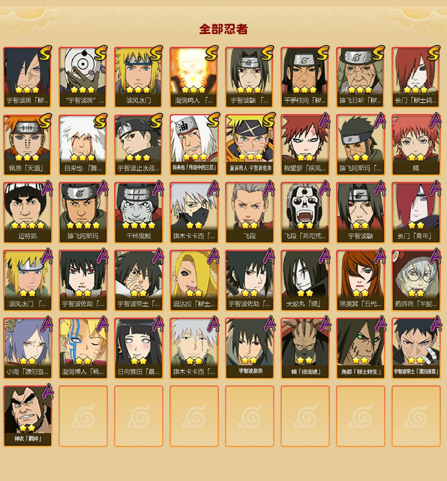 【S级忍者】:长门「秽土转生」(3星),猿飞日斩「秽土转生」(3星),千手柱间「秽土转生」(3星),宇智波斑「秽土转生·解」(3星),宇智波鼬「须佐能乎」(3星),宇智波止水「须佐能乎」(3星),自来也「舞之豪杰」(3星),自来也「传说中的三忍」(3星),波风水门