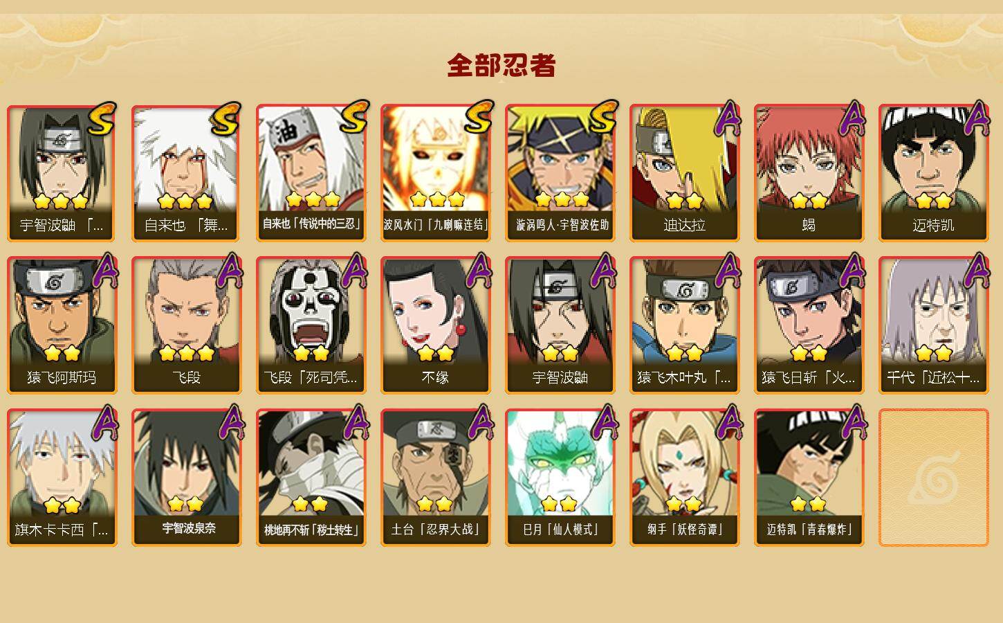 【HYX3508】V0/S忍5/A忍18/舞之豪杰-自来也/2星桃地再不斩「秽土转生」/3星波风水门「九喇嘛连结」/死司凭血-飞段/宇智波鼬/3星自来也「传说中的三忍」/迈特凯/火影继承人-猿飞日斩/3星飞段/蝎/2星纲手「妖怪奇谭」/3星漩涡鸣人·宇智波佐助/猿飞阿斯玛/2星宇智波泉奈/迪达拉/幻之真容-旗木卡卡西/2星巳月「仙人模式」/不缘/2星迈特凯「青春爆炸」/2星土台「忍界大战」/猿飞木叶丸/近松十人卫-千代/须佐能乎-宇智波鼬