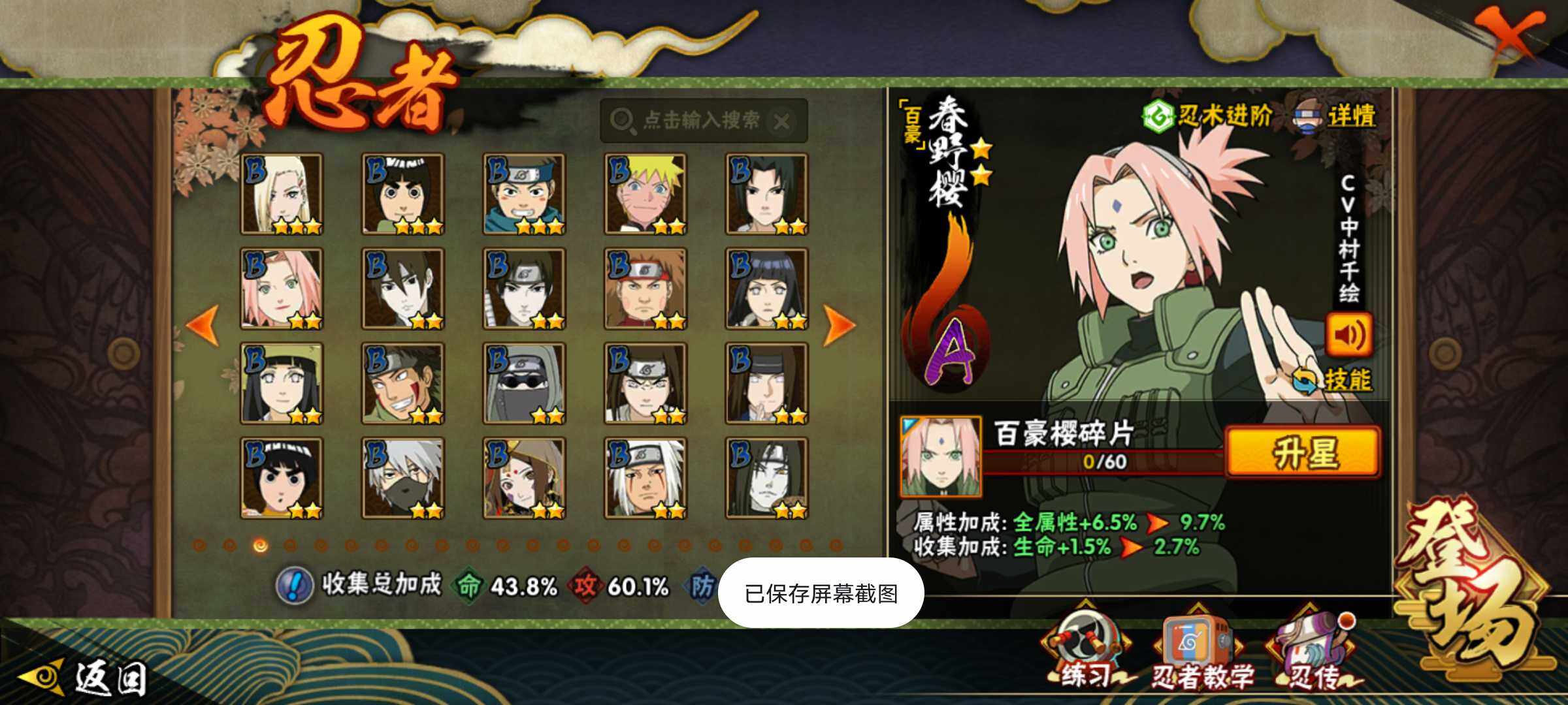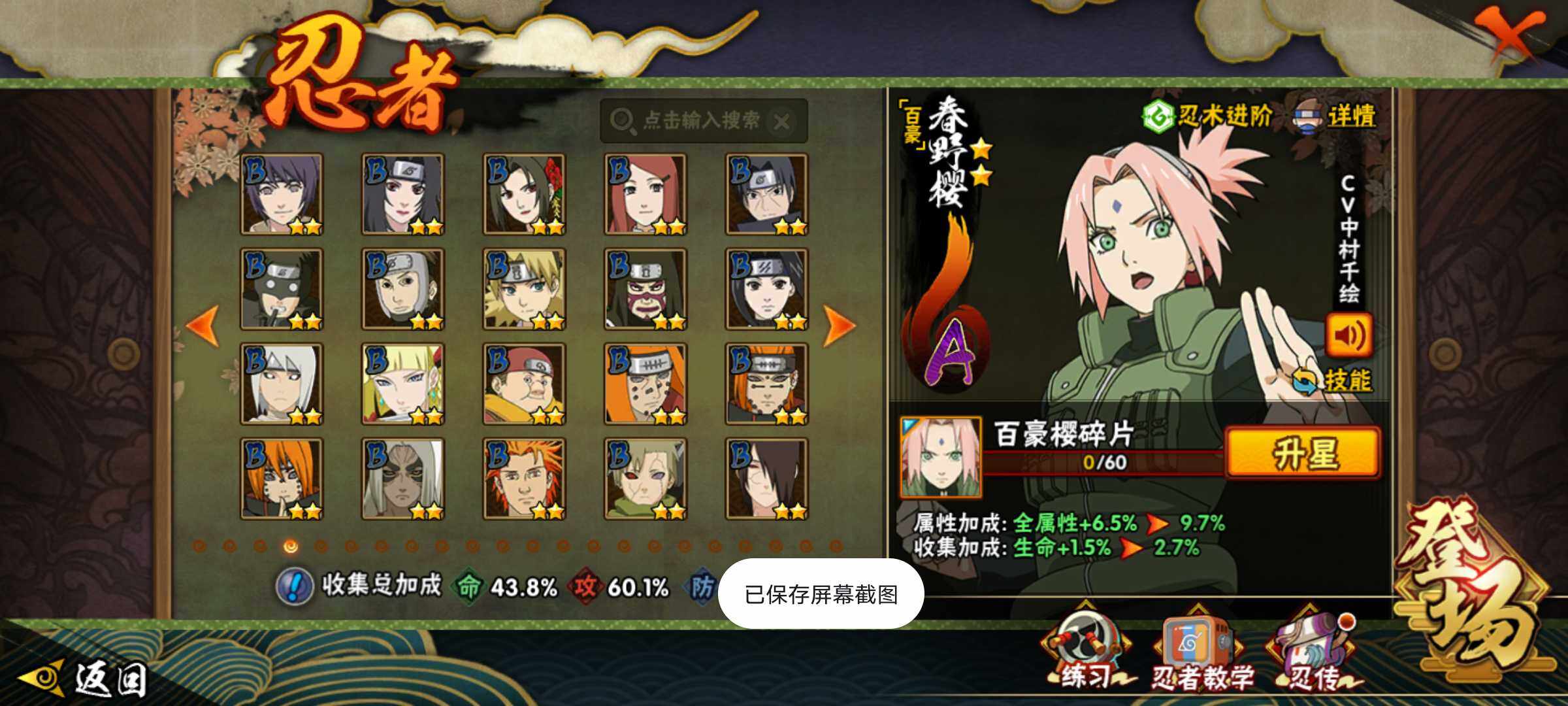【S级忍者】:宇智波鼬「须佐能乎」(3星),自来也「舞之豪杰」(3星),大蛇丸(3星),波风水门(3星),佩恩「天道」(3星),宇智波佐助「永恒万花筒」(3星),漩涡鸣人·宇智波佐助(3星)