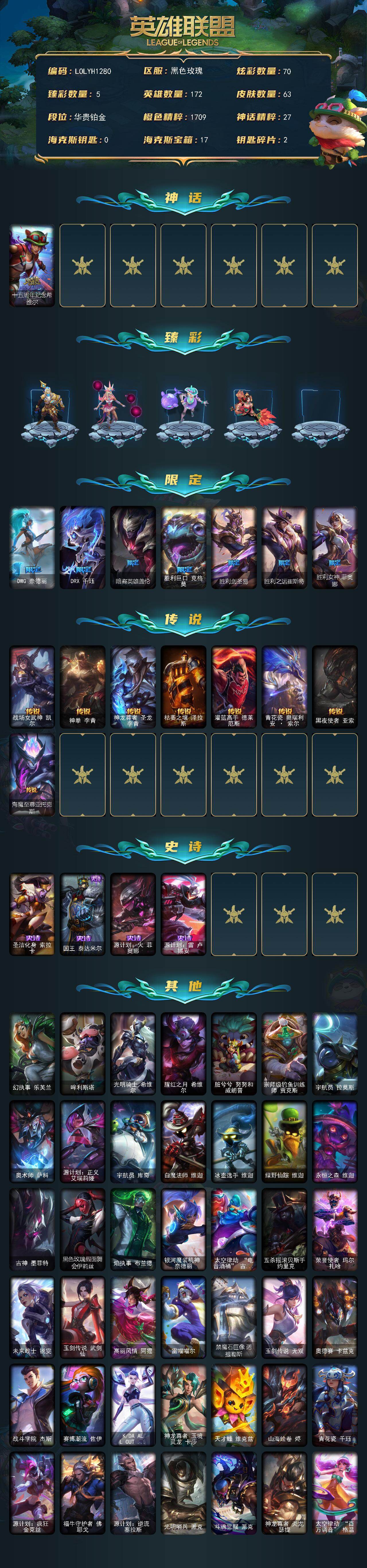 172英雄/63皮肤/1神话/8限定/5臻彩/70炫彩/8传说/4史诗/铂金/