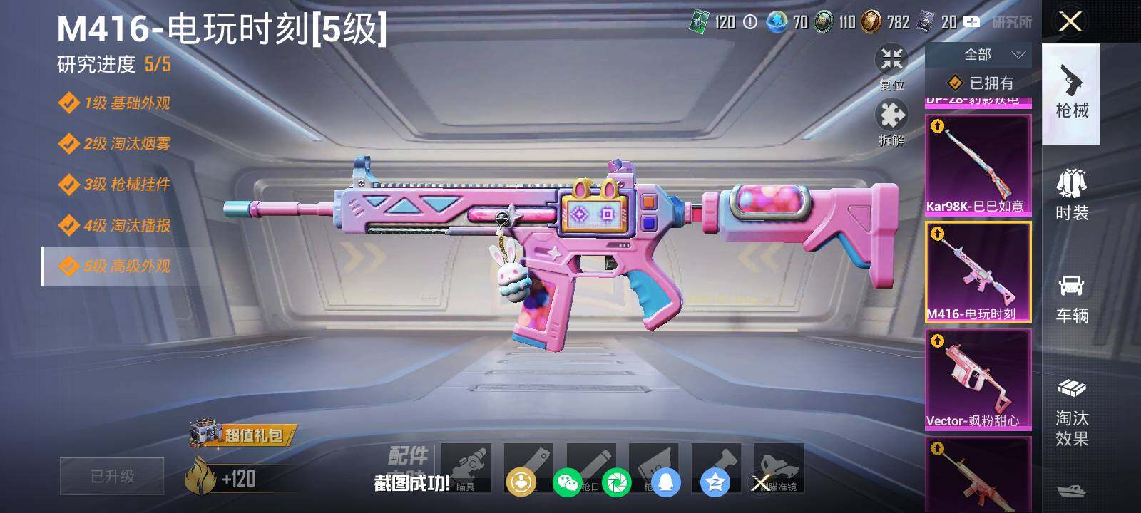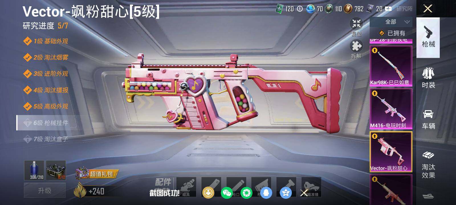 【粉色枪皮等级】:AKM-梦之光华(五级),SCAR-L-桃夭倾城(五级),M416-电玩时刻(五级),Vector-飒