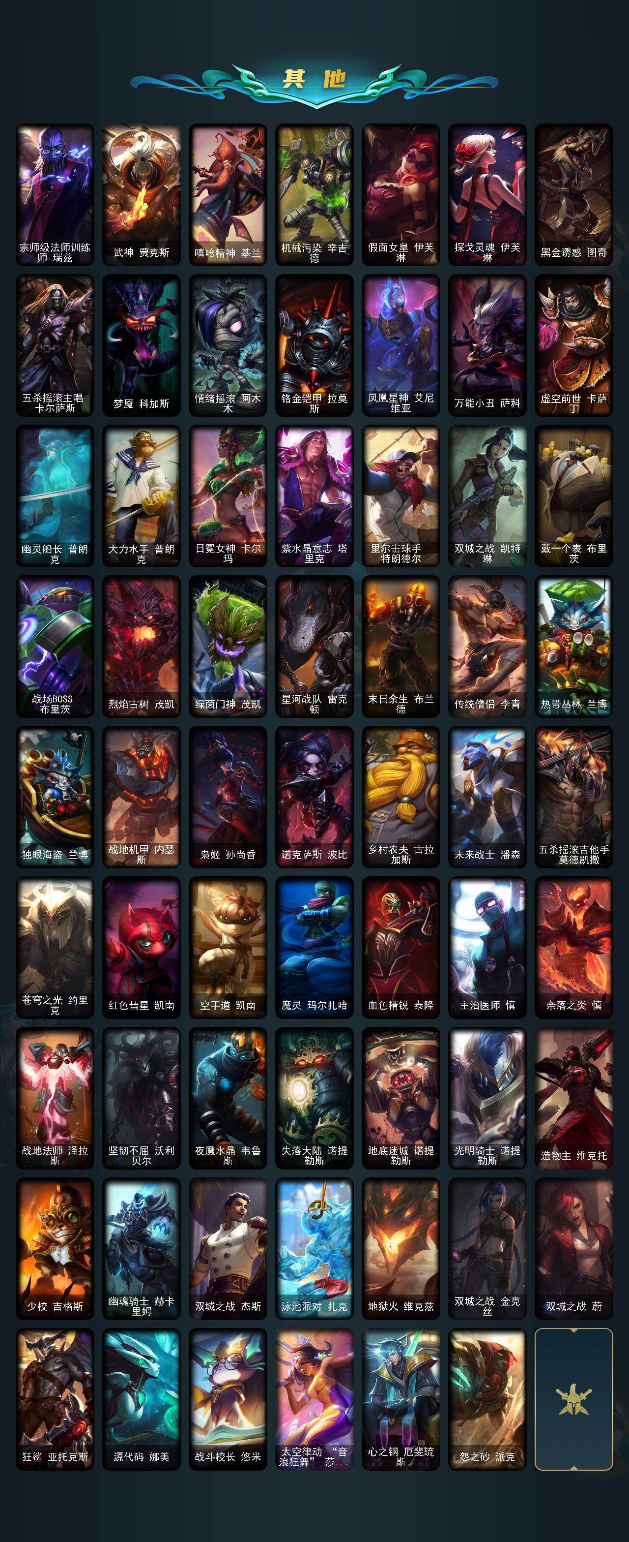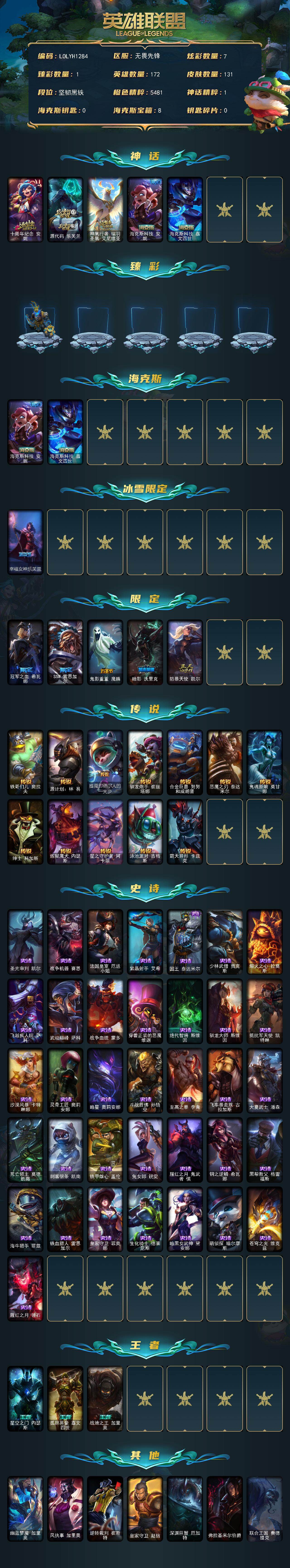 172英雄/131皮肤/5神话/6限定/1臻彩/7炫彩/12传说/36史诗/未定级/十周年纪念安妮/