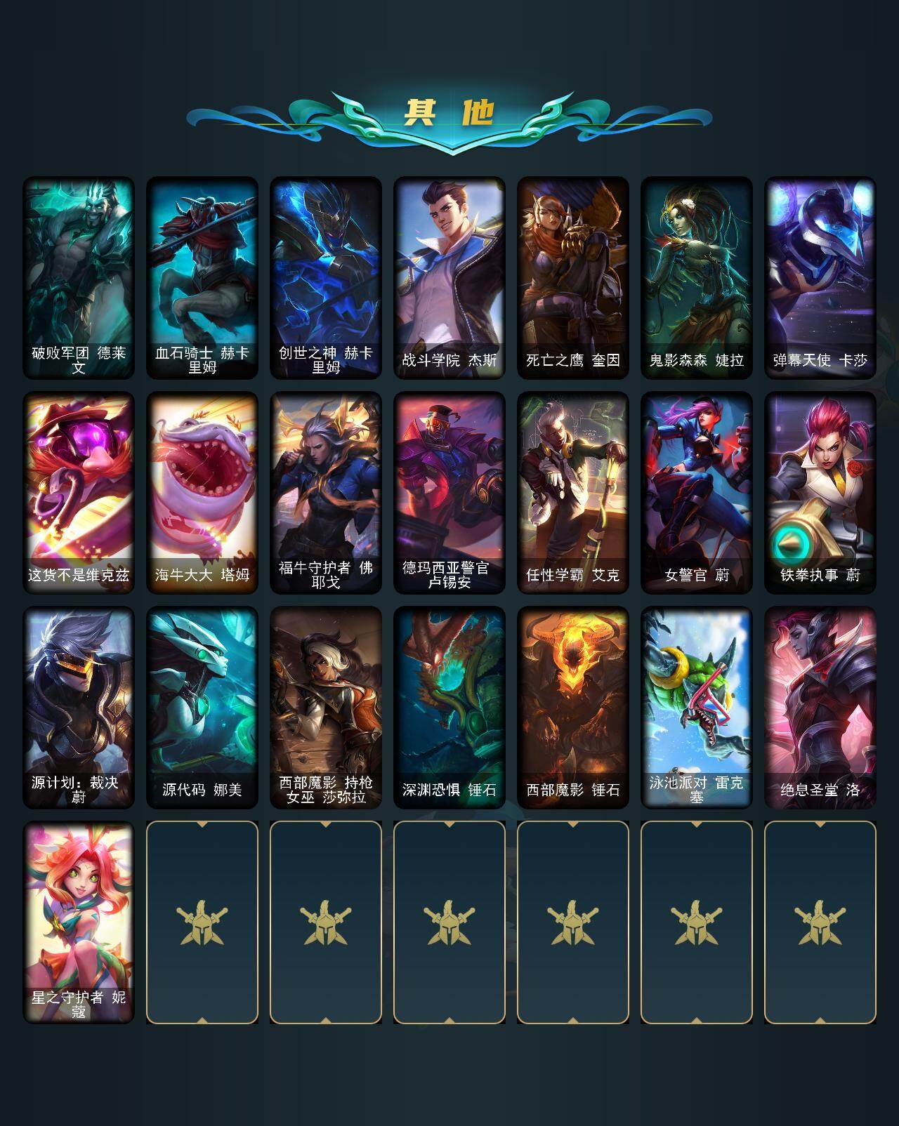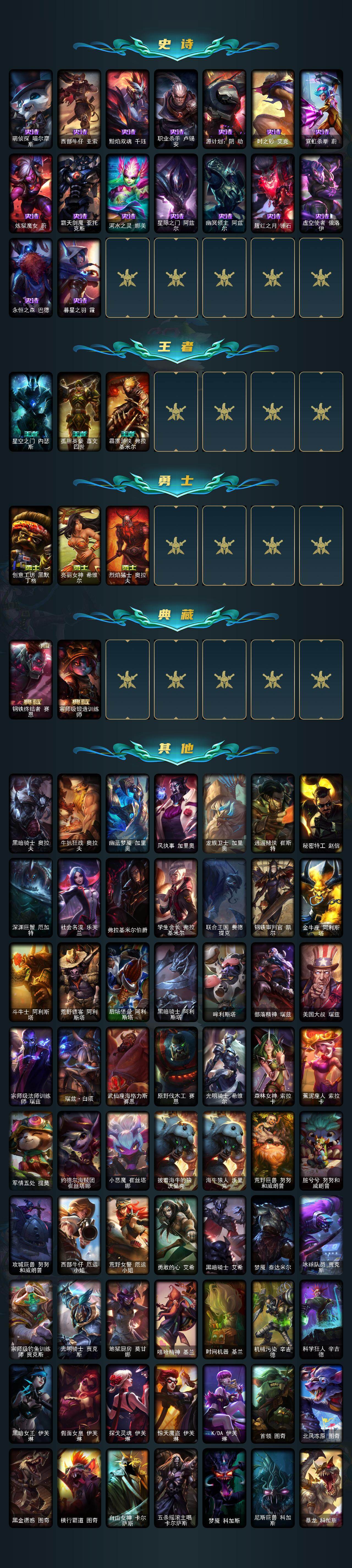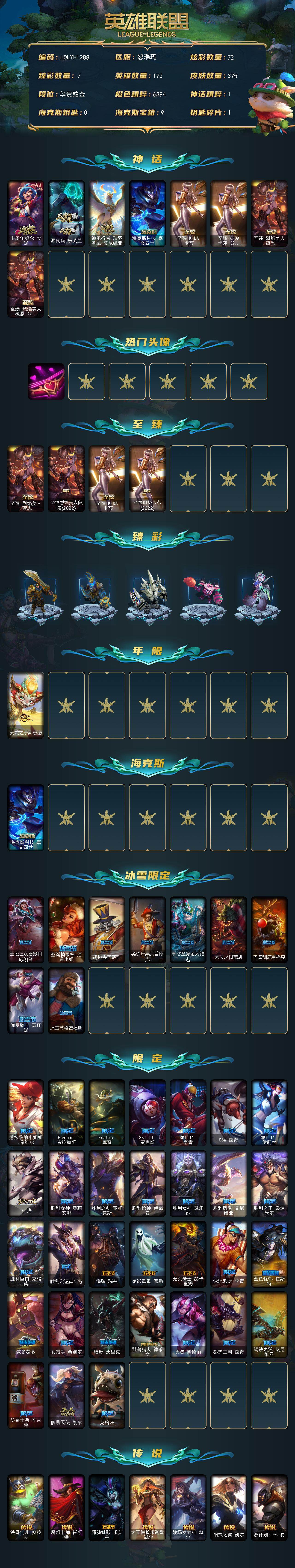 172英雄/375皮肤/8神话/41限定/7臻彩/72炫彩/28传说/100史诗/铂金/