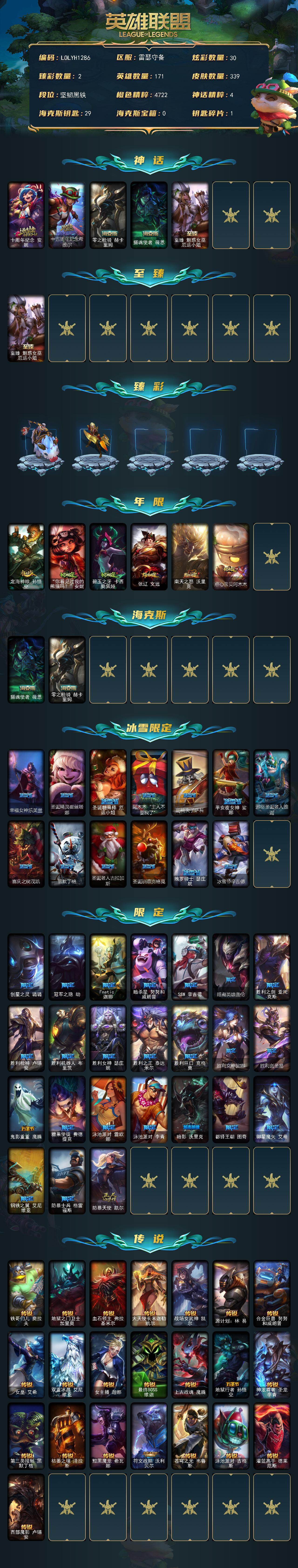 【LOLYH1286】171英雄/339皮肤/5神话/44限定/2臻彩/30炫彩/22传说/85史诗/未定级/十周年纪念安妮/十五周年纪念希维尔/零之枪骑赫卡里姆/摄魂使者薇恩/至臻魅惑女巫厄运小姐/无畏骑士瑟庄妮赤子初心/征服者韦鲁斯炫金/定海神珍孙悟空/你看见过我的熊猫吗安妮/碧玉之牙卡西奥佩娅/张辽文远/南天之怒沃里克/点心宝贝阿木木/幸福女神乐芙兰/圣诞精灵崔丝塔娜/圣诞糖果棒厄运小姐/阿木木“主人不要我了”/胡桃夹子萨科/平安夜女神娑娜/邪恶圣诞老人维迦/喜庆之树茂凯/雪默丁格/圣诞老