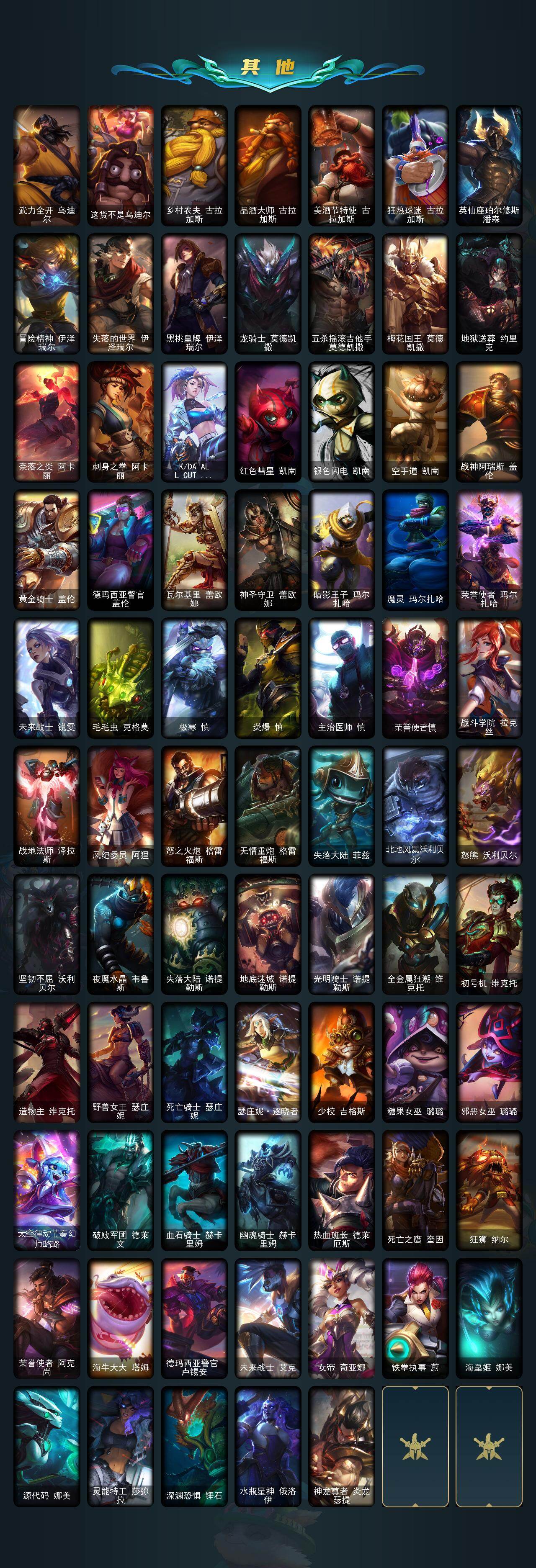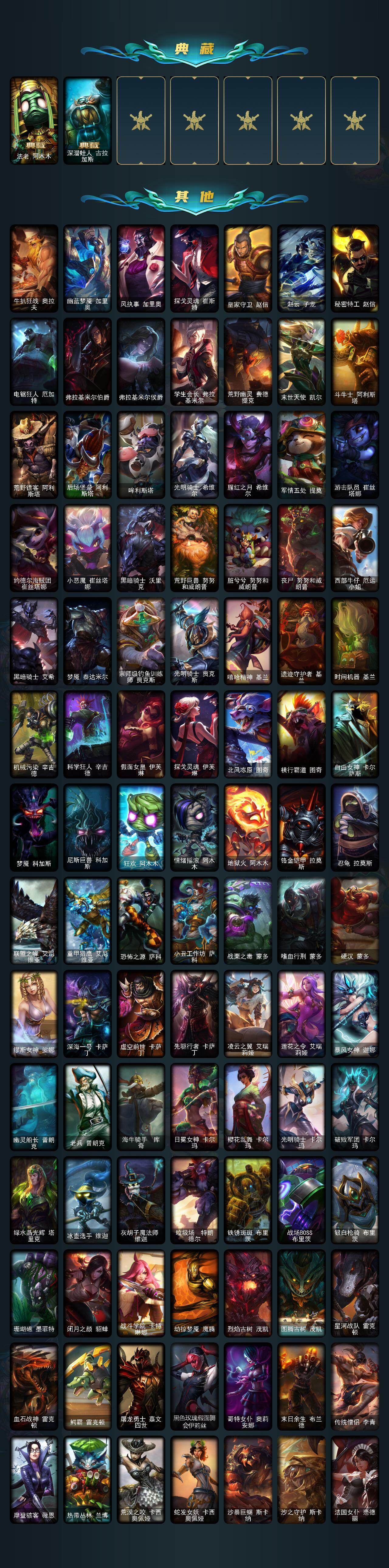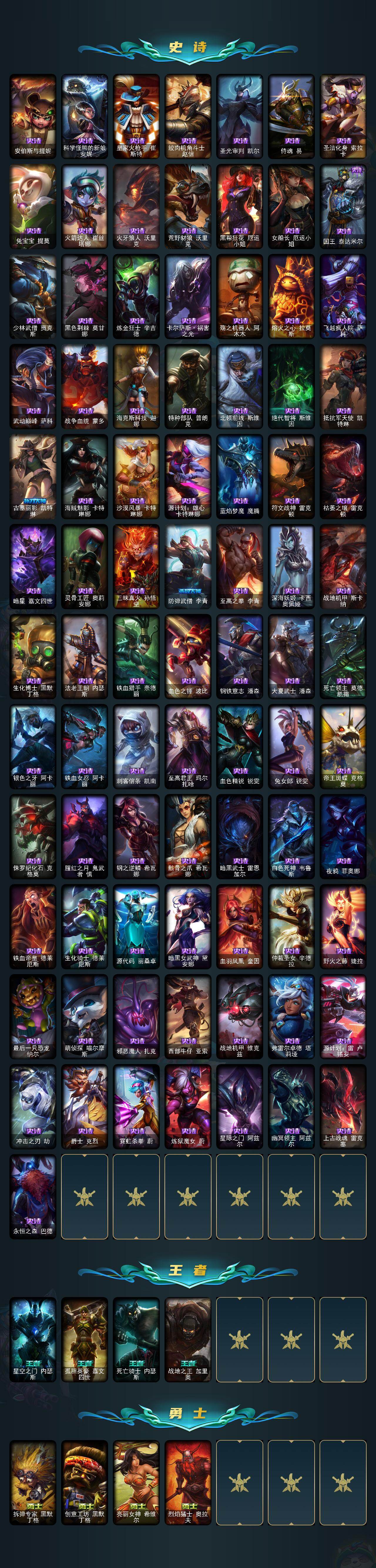 171英雄/339皮肤/5神话/44限定/2臻彩/30炫彩/22传说/85史诗/未定级/十周年纪念安妮/