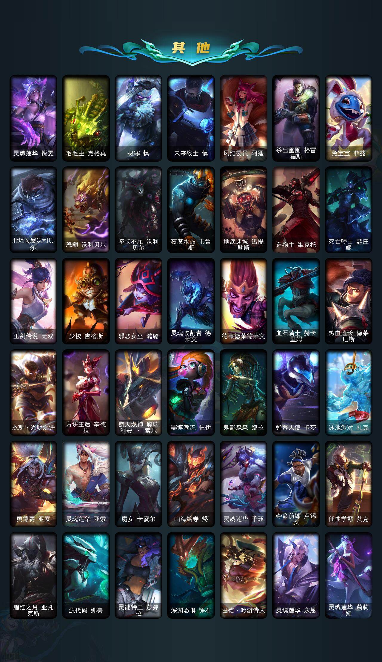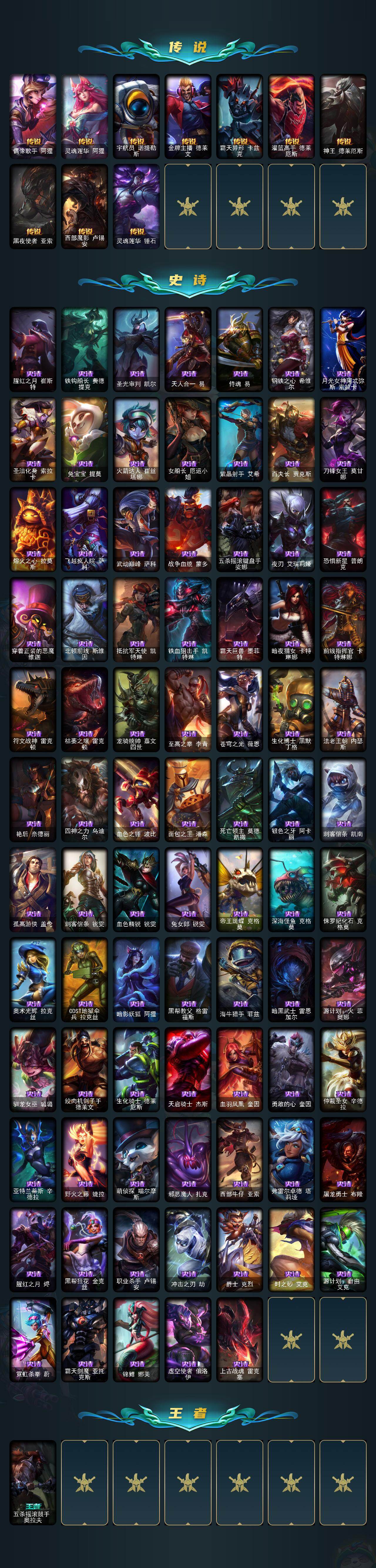 160英雄/295皮肤/1终极/8神话/38限定/1臻彩/64炫彩/24传说/82史诗/未定级/十周年纪念安妮/