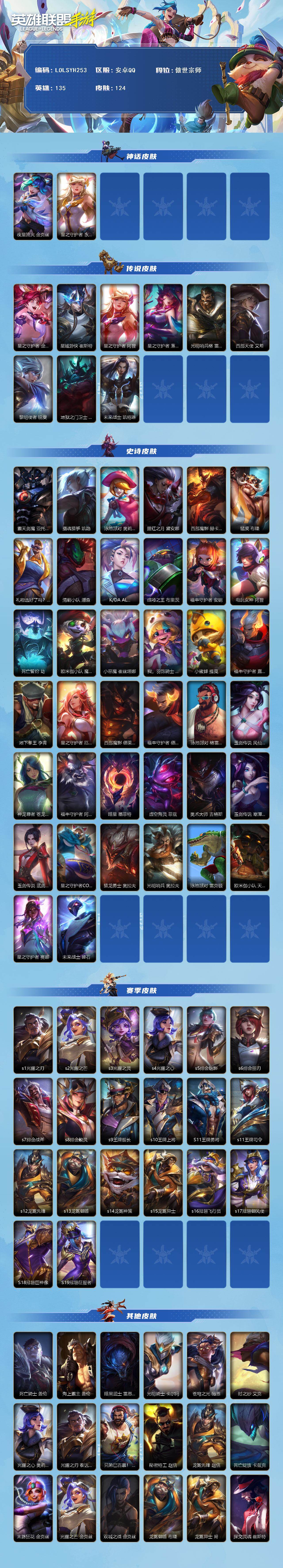 【LOLSYH253】135英雄/124皮肤/傲世宗师/夜星流火 金克丝/星之守护者 永绽盛芒 阿狸/星之守护者 金克丝/星域游侠 崔斯特/星之守护者 阿狸/星之守护者 落 霞/光明哨兵 格雷福斯/西部天使 艾希/黎明使者 锐雯/地狱之门卫士 加里奥/未来战士 凯特琳/霸天剑魔 亚托克斯/摄魂猎手 凯隐/泳池派对 奥莉安娜/腥红之月 黛安娜/西部魔影 赫卡里姆/猛虎 布隆/礼物选好了吗? 布隆/清剿小队 潘森/K/DA ALL OUT 阿卡丽/战场之王 布里茨/福牛守护者 安妮/电玩女神 阿狸/