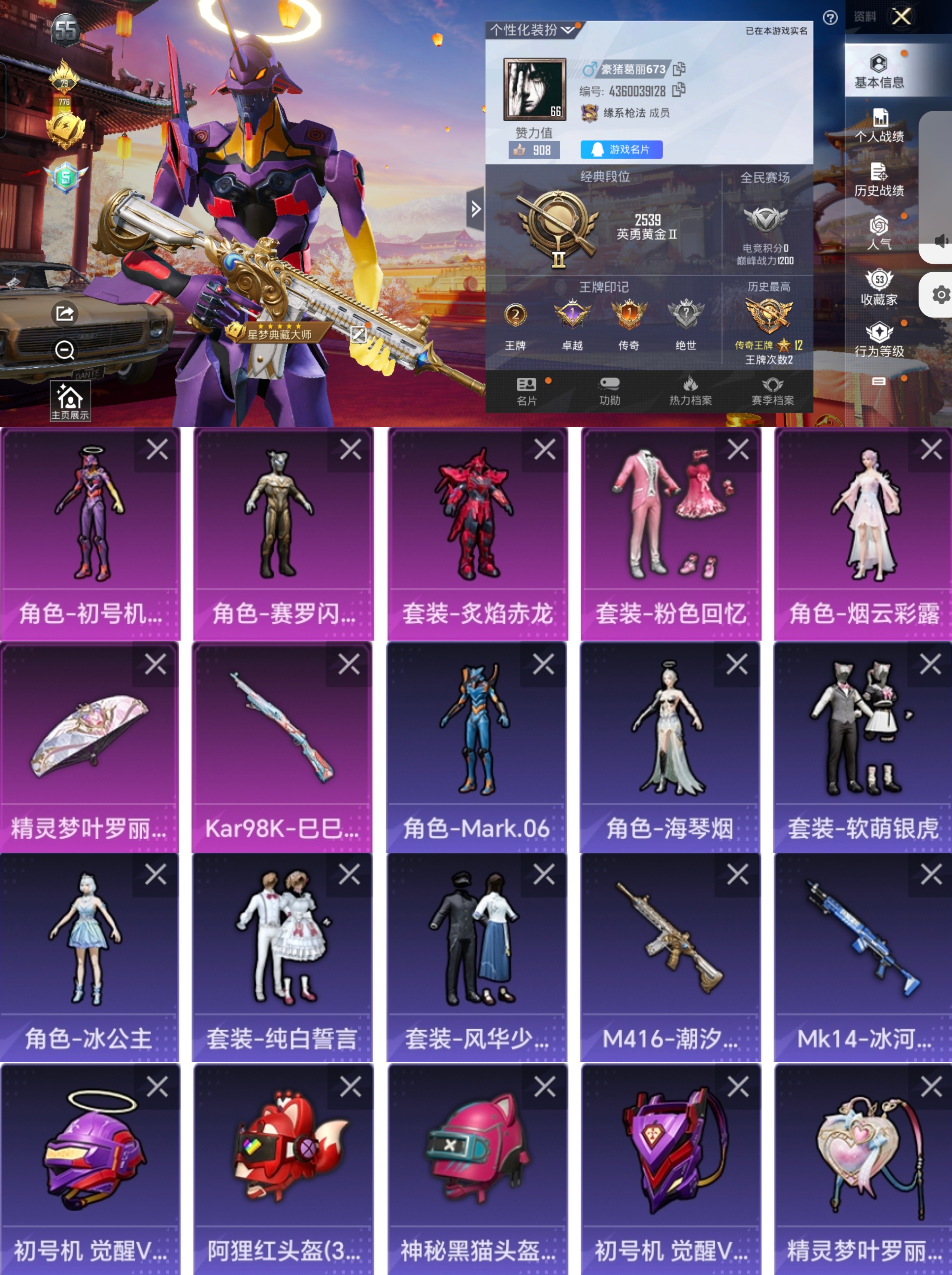 LGH421【紫螳螂-觉醒初号机5粉1特赛罗闪耀型烟云彩露炙焰赤龙素材号】(不可二次) 安卓Q-59366热力值 2王牌印记 历史传奇王牌12星 148套装 193枪皮 【5粉装】 觉醒初号机 烟云彩露 粉色回忆 炙焰赤龙 赛罗闪耀型 【1特效枪】 Kar98K-巳巳如意 (5级) 【14热门】 Mark.06 龟仙人 雪山精英 万圣娃娃 软萌银虎 纯白誓言 抹茶蜜豆 玄武圣者 机械英豪 破蛋小黄
