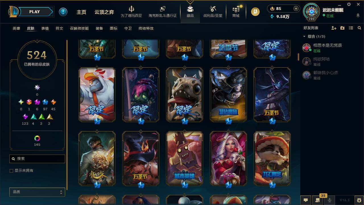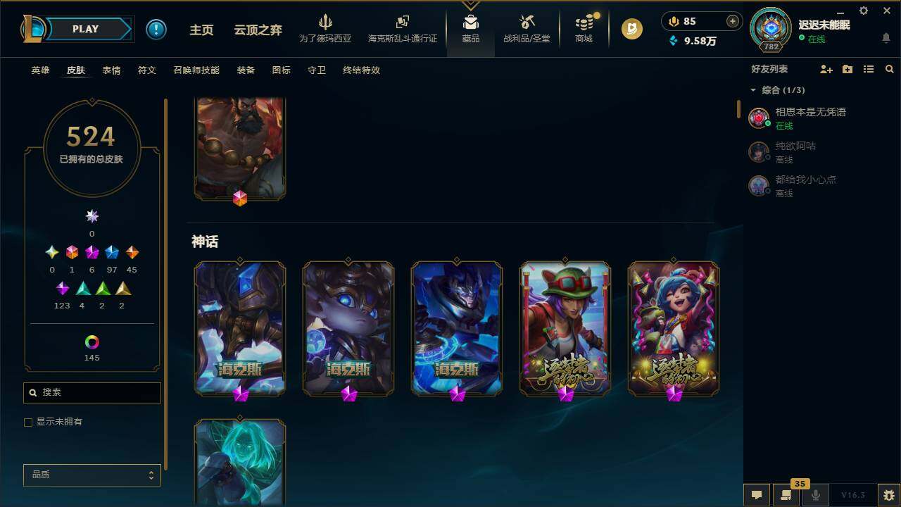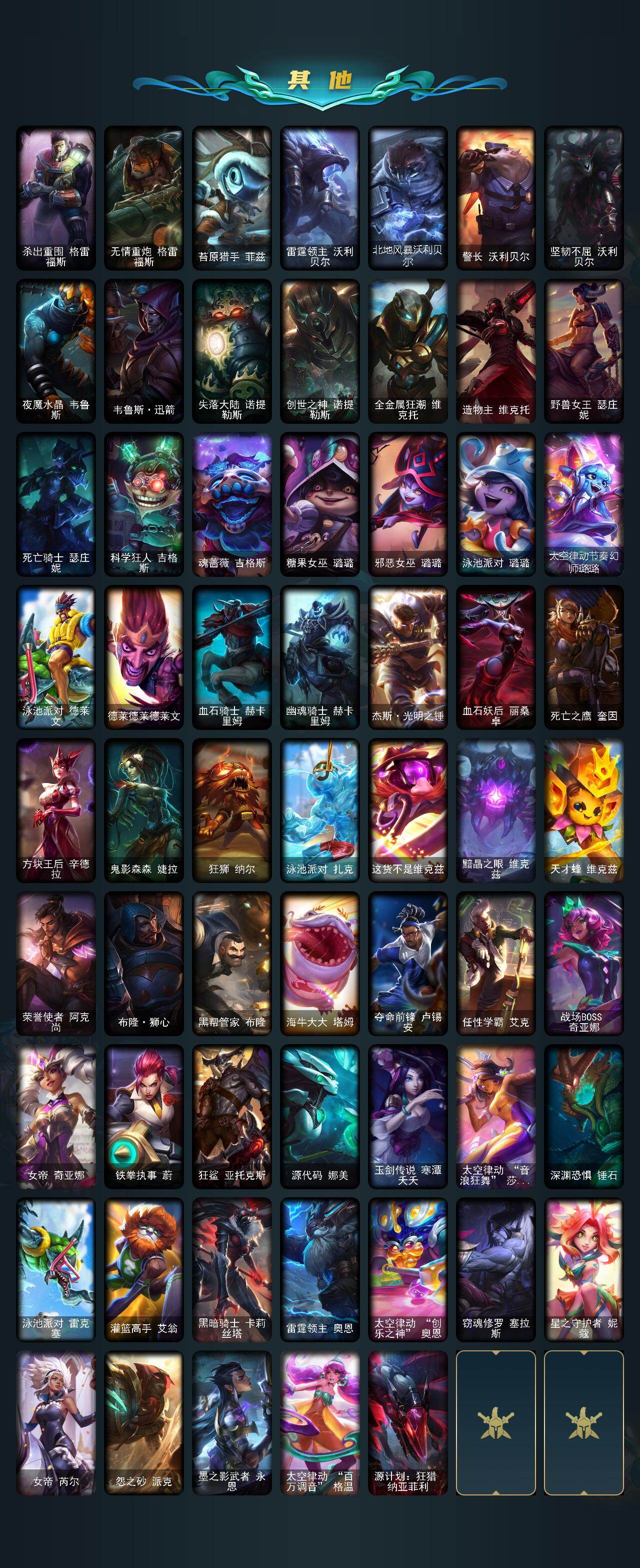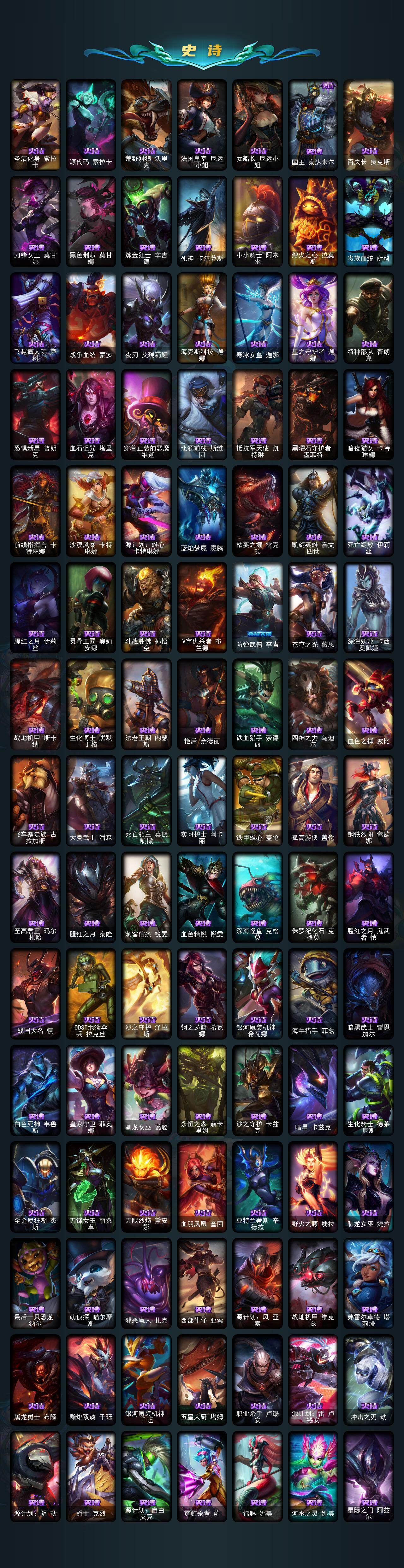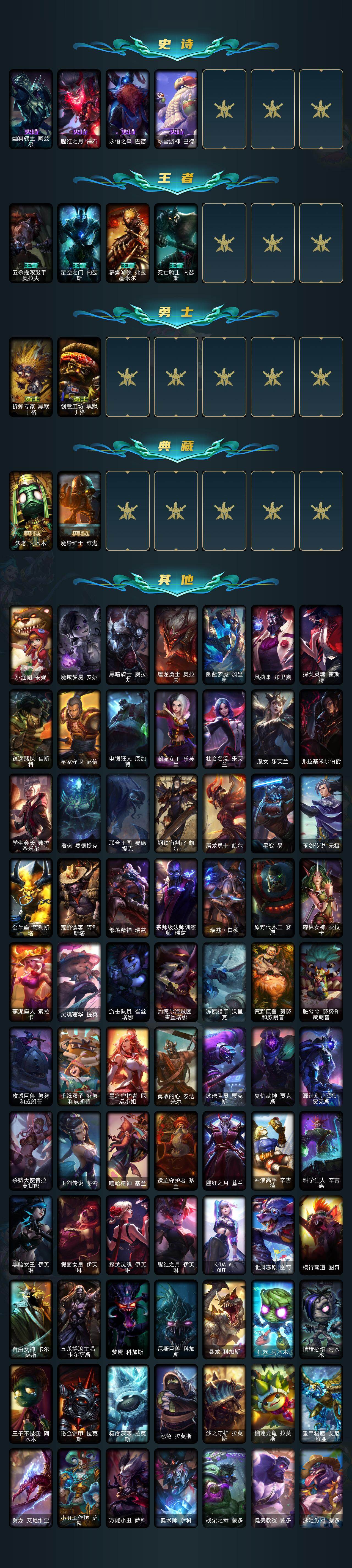 172英雄/524皮肤/1终极/6神话/97限定/14臻彩/164炫彩/45传说/123史诗/未定级