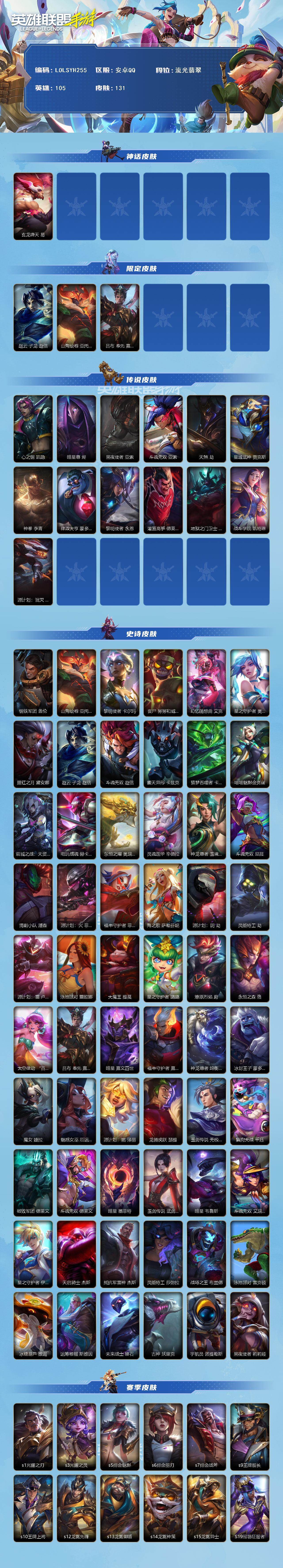 【LOLSYH255】105英雄/131皮肤/2神话/13传说/流光翡翠/玄龙绛天 易/赵云 子龙 赵信/山海绘卷 亚托克斯/吕布 奉先 嘉文四世/心之钢 凯隐/暗星尊 烬/黑夜使者 亚索/斗魂无双 亚索/天煞 劫/星域武神 贾克斯/神拳 李青/律政大亨 蒙多医生/黎明使者 永恩/灌篮高手 德莱厄斯/地狱之门卫士 加里奥/战斗学院 凯特琳/源计划:泯灭 雷克顿/钢铁军团 盖伦/黎明使者 卡尔玛/丧尸 努努和威朗普/幻忆随想曲 艾克/星之守护者 奥莉安娜/腥红之月 黛安娜/斗魂无双 赵信/霸天异形