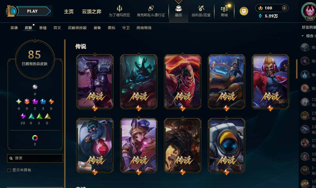 169英雄/85皮肤/2神话/3限定/2炫彩/9传说/20史诗/未定级