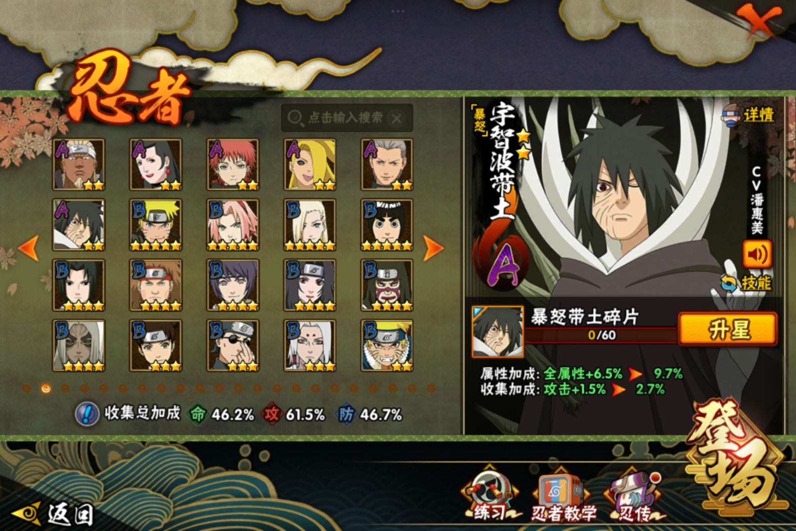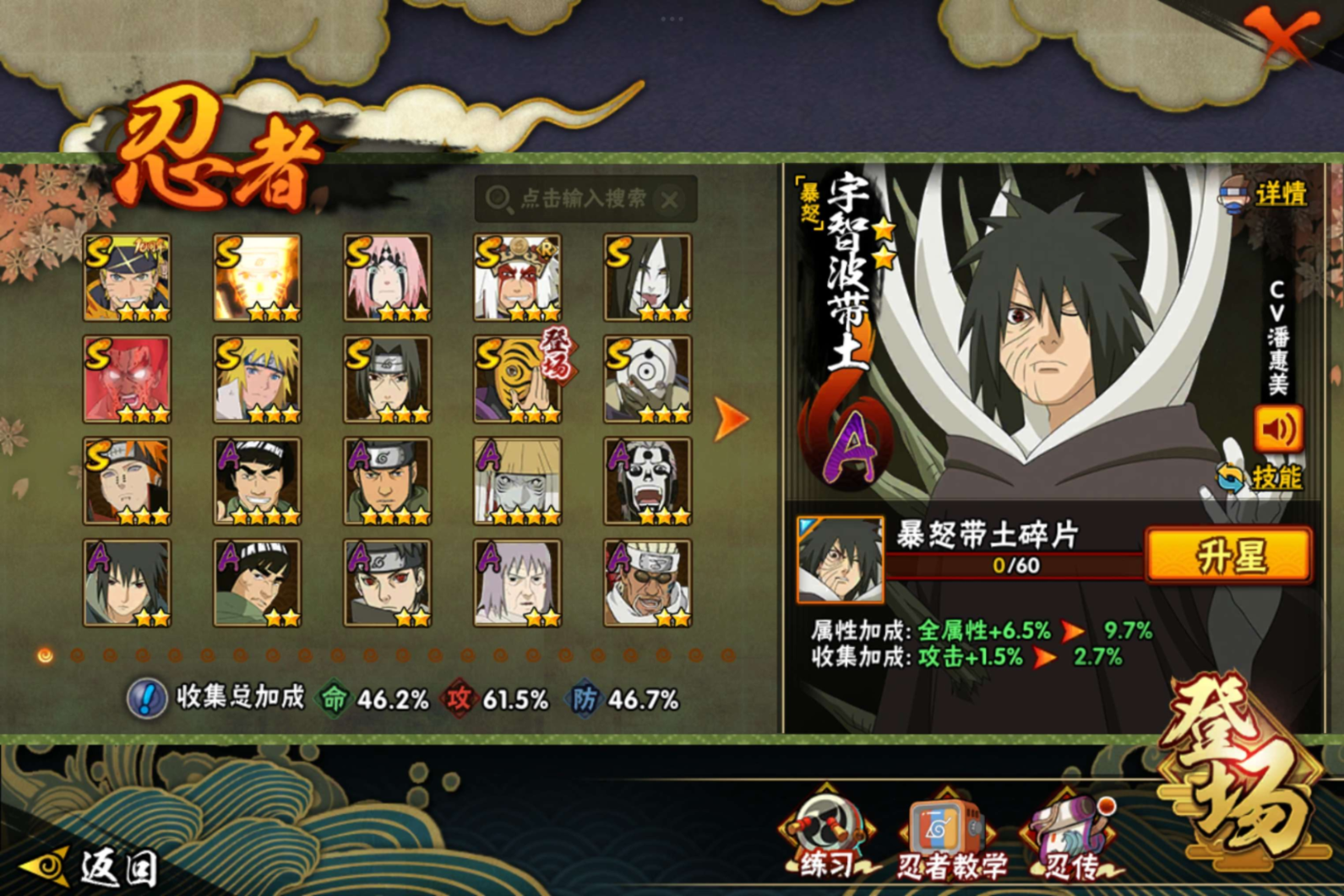 【S级忍者】迈特凯「死门」(3星),春野樱「忍界大战」(3星),漩涡鸣人「九喇嘛连结」(3星),宇智波斑「白面具」(3星),自来也「舞之豪杰」(3星),宇智波鼬「须佐能乎」(3星),漩涡鸣人·宇智波佐助(3星),神秘面具男(3星),佩恩「天道」(3星),波风水门(3星),大蛇丸(3星),
