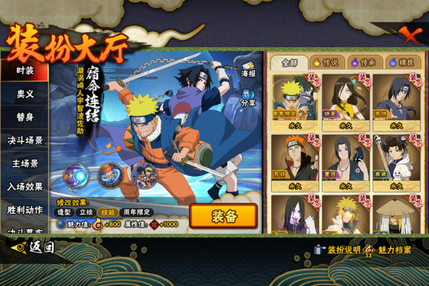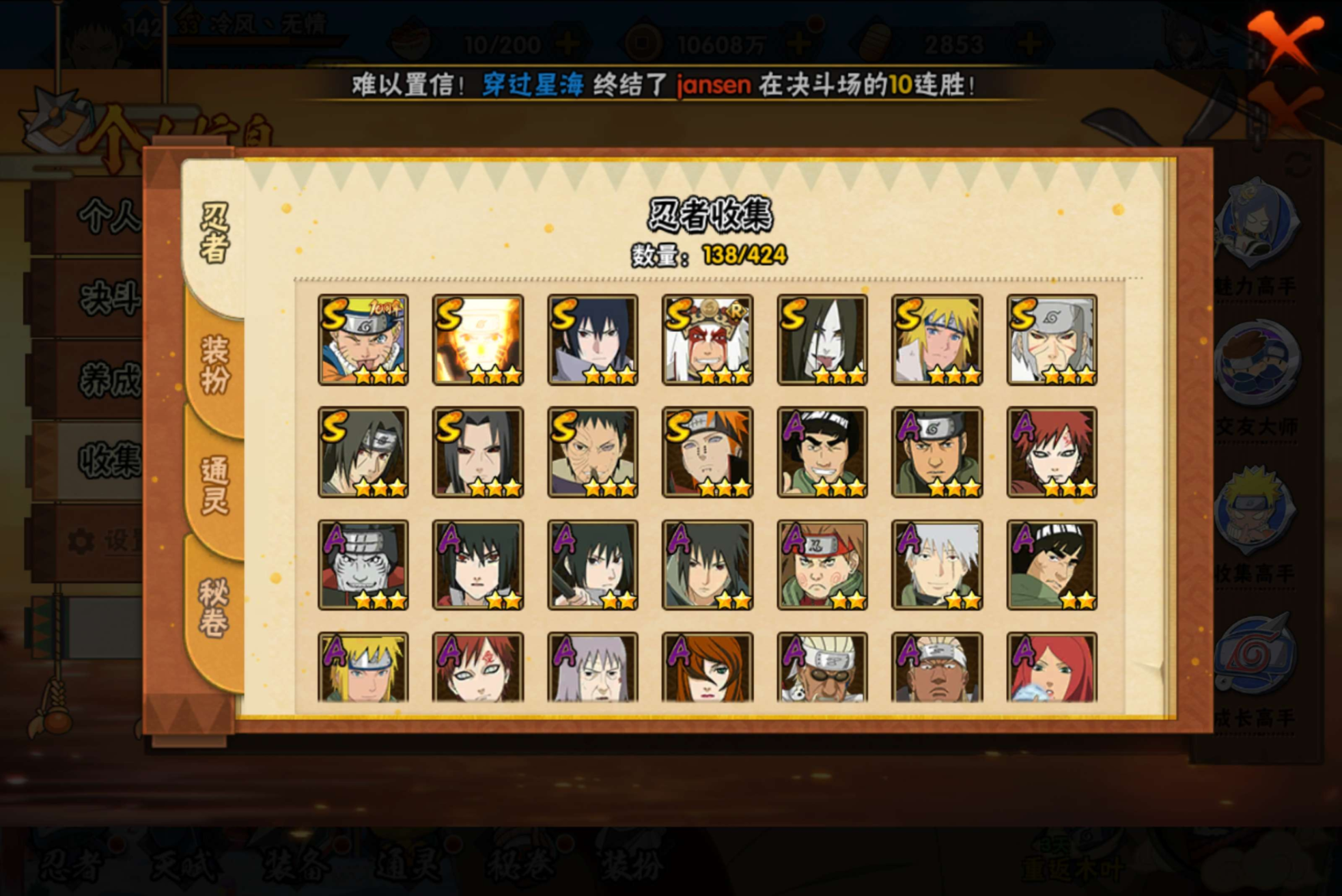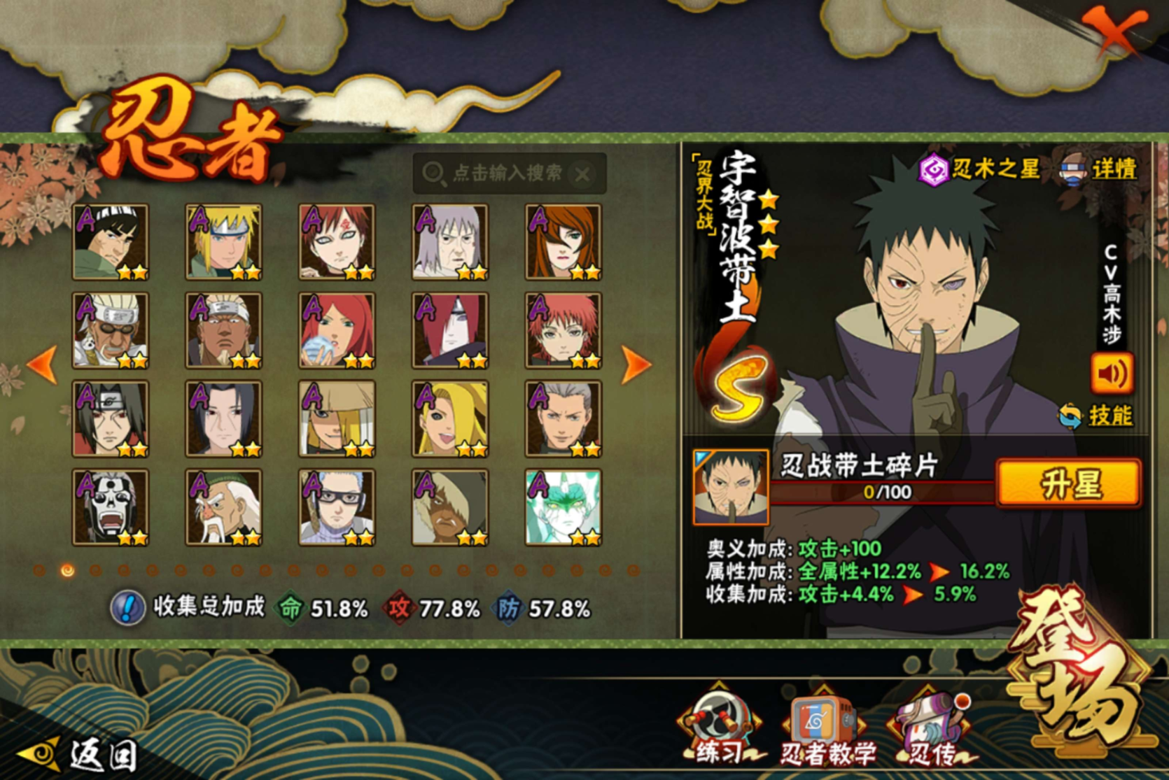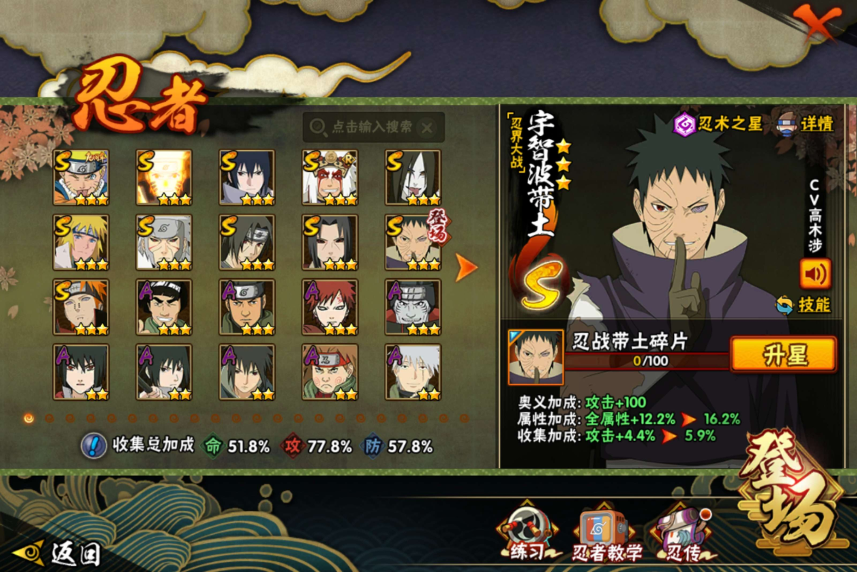 【S级忍者】宇智波带土「忍界大战」(3星),宇智波佐助「永恒万花筒」(3星),漩涡鸣人「九喇嘛连结」(3星),千手扉间「秽土转生」(3星),自来也「舞之豪杰」(3星),宇智波鼬「秽土转生」(3星),宇智波鼬「须佐能乎」(3星),漩涡鸣人·宇智波佐助(3星