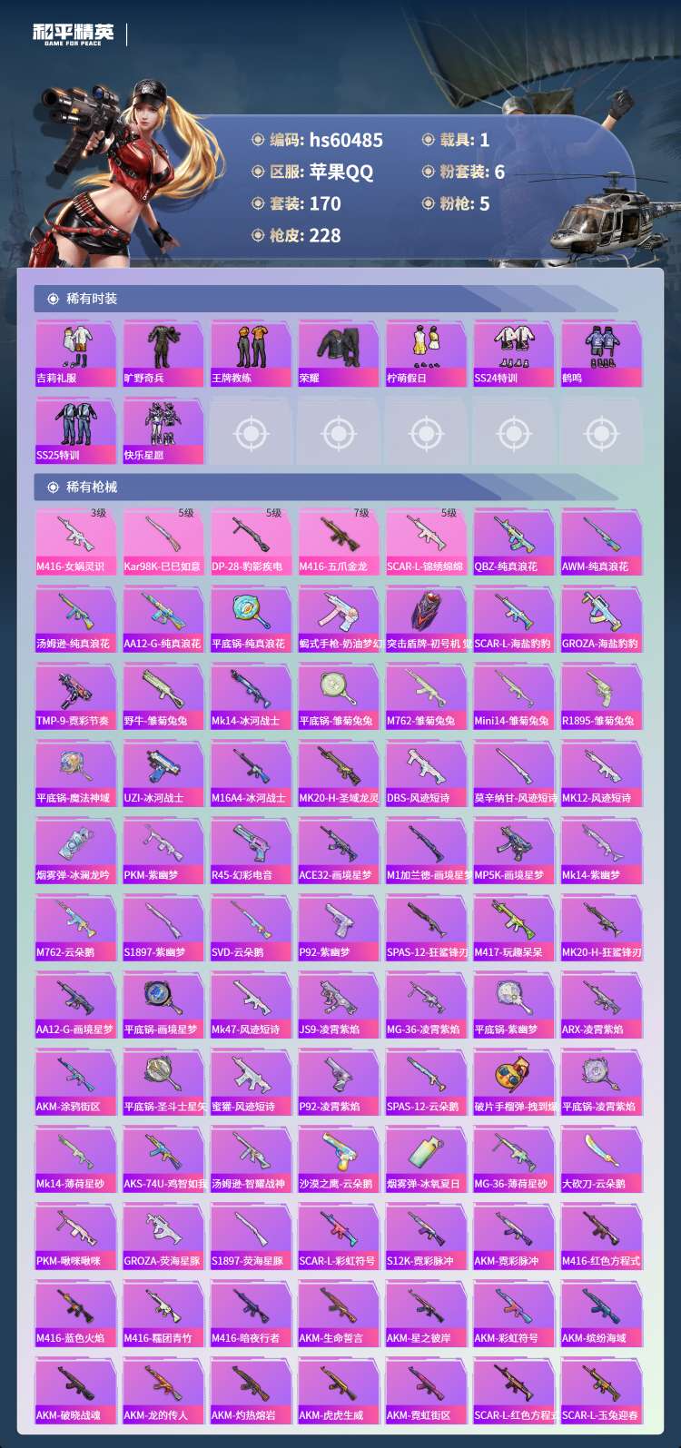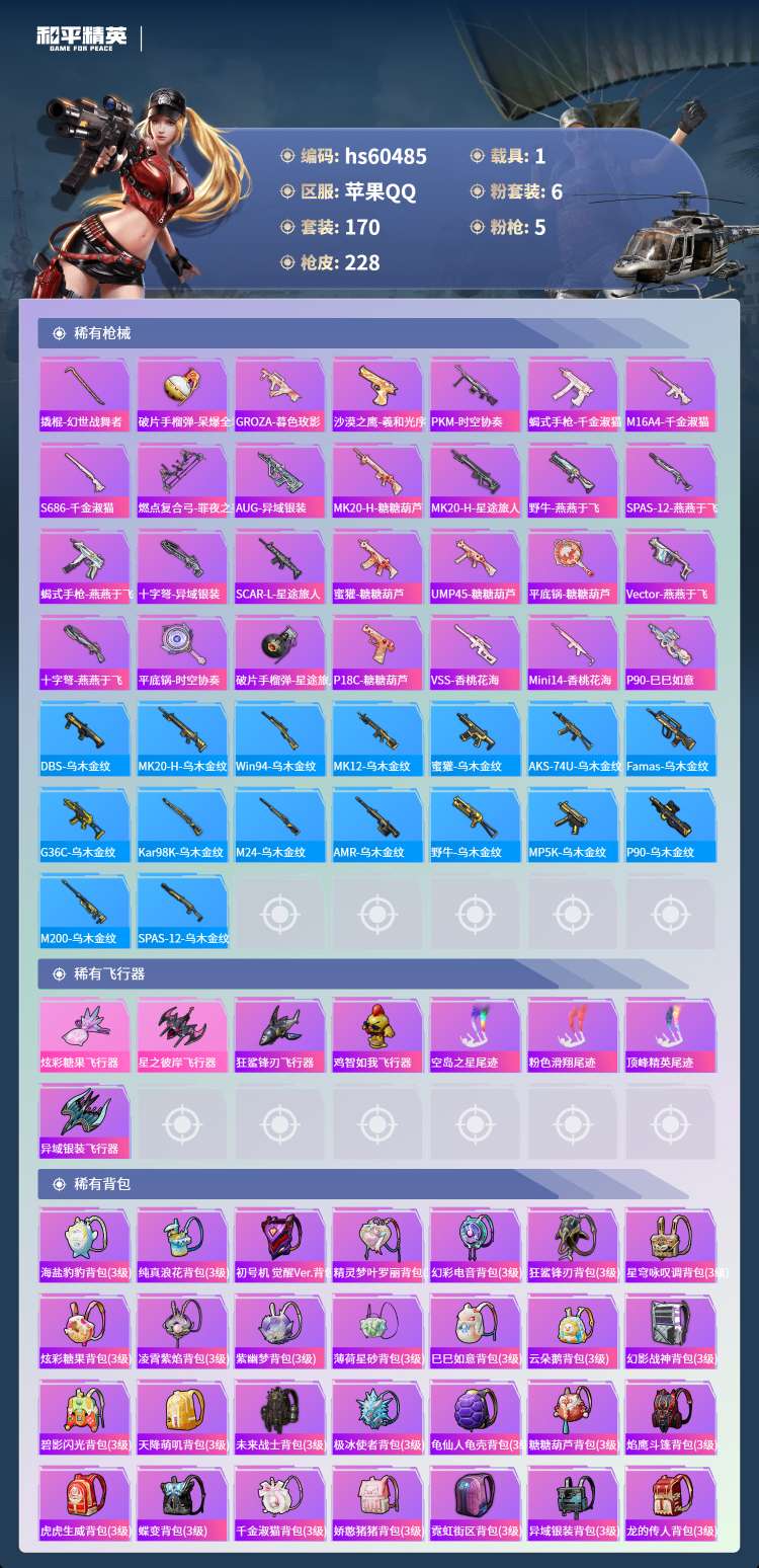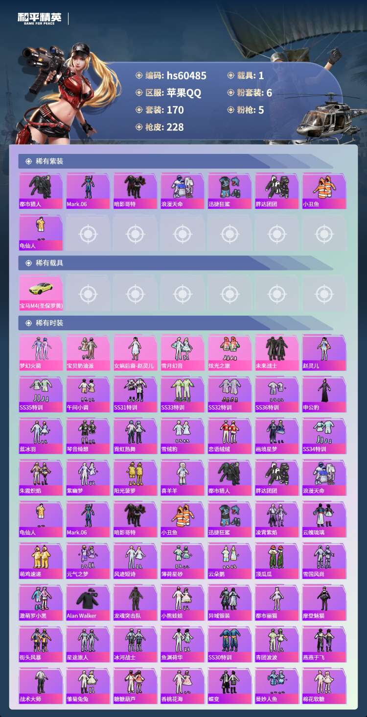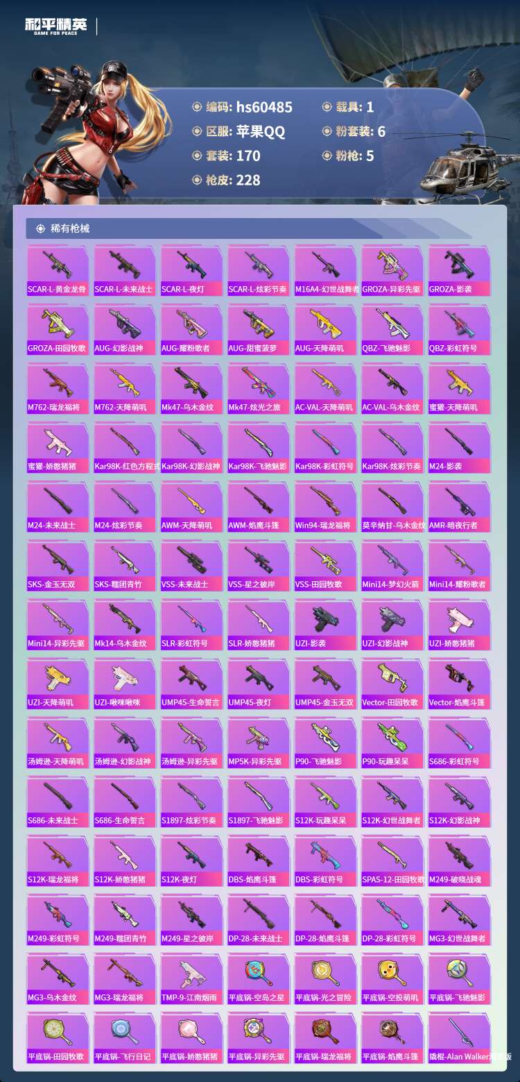 hs60485 苹果手Q-19王牌印记-有战神框-6粉装-5特效枪-1载具-70535热力值-170