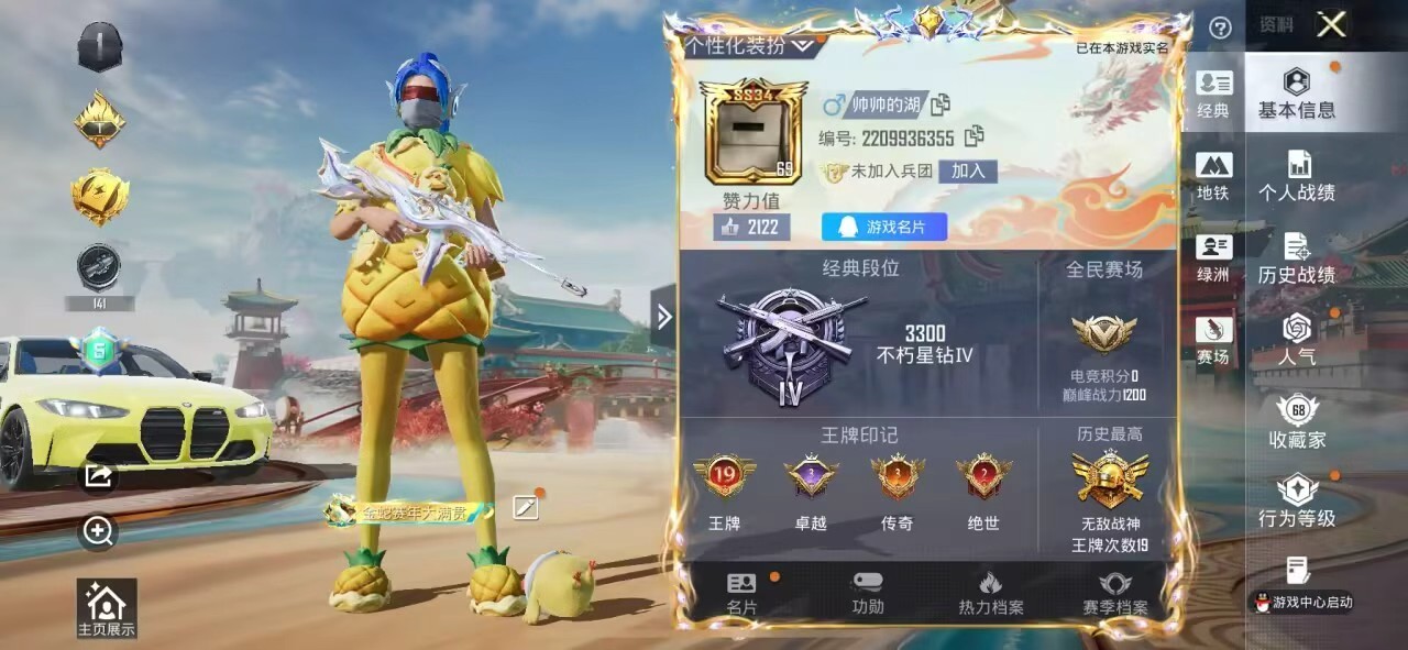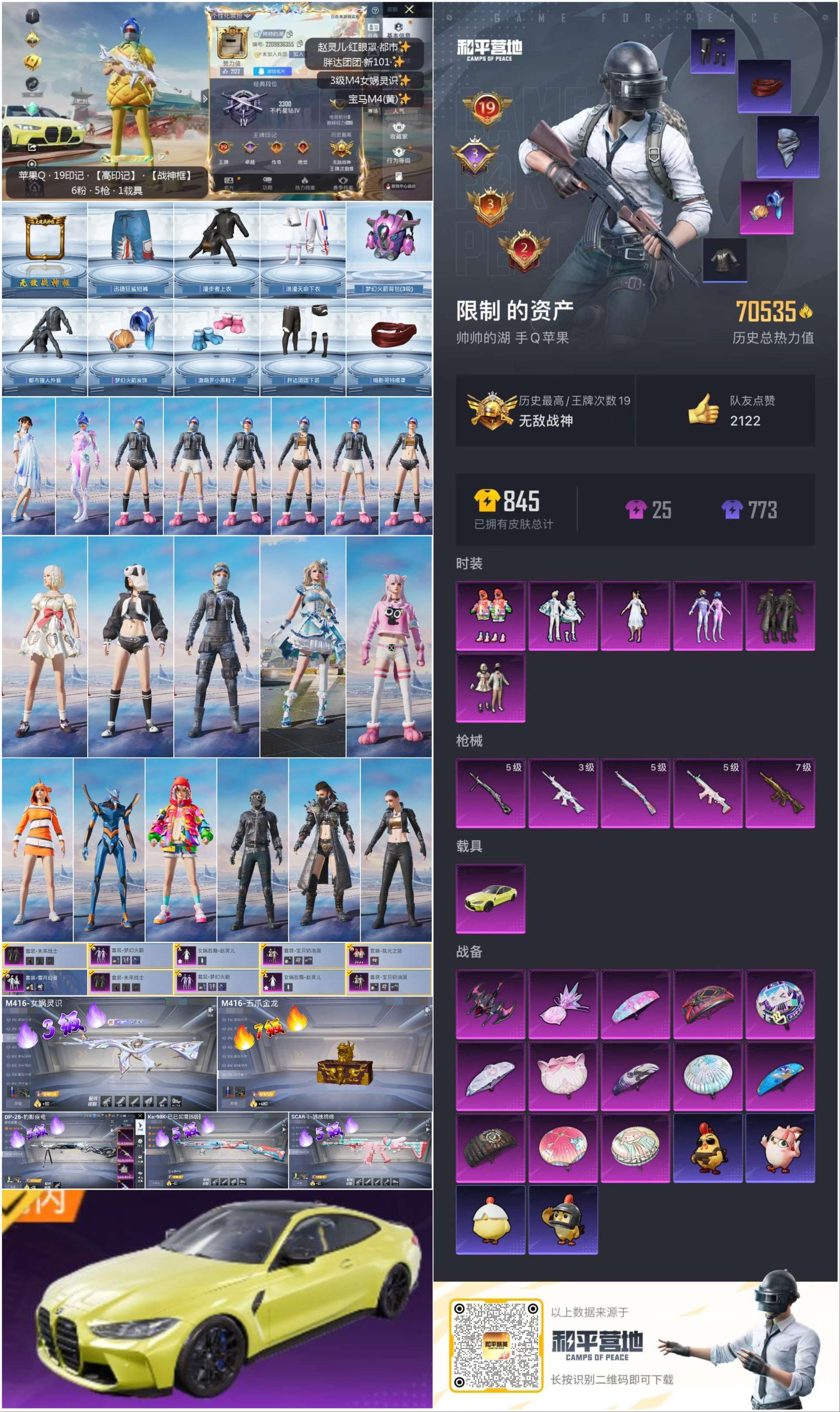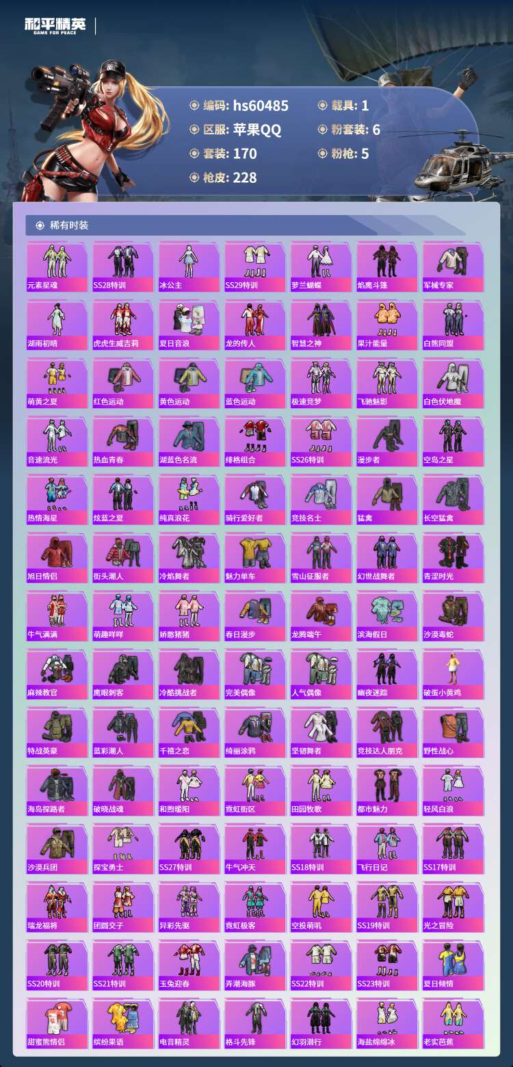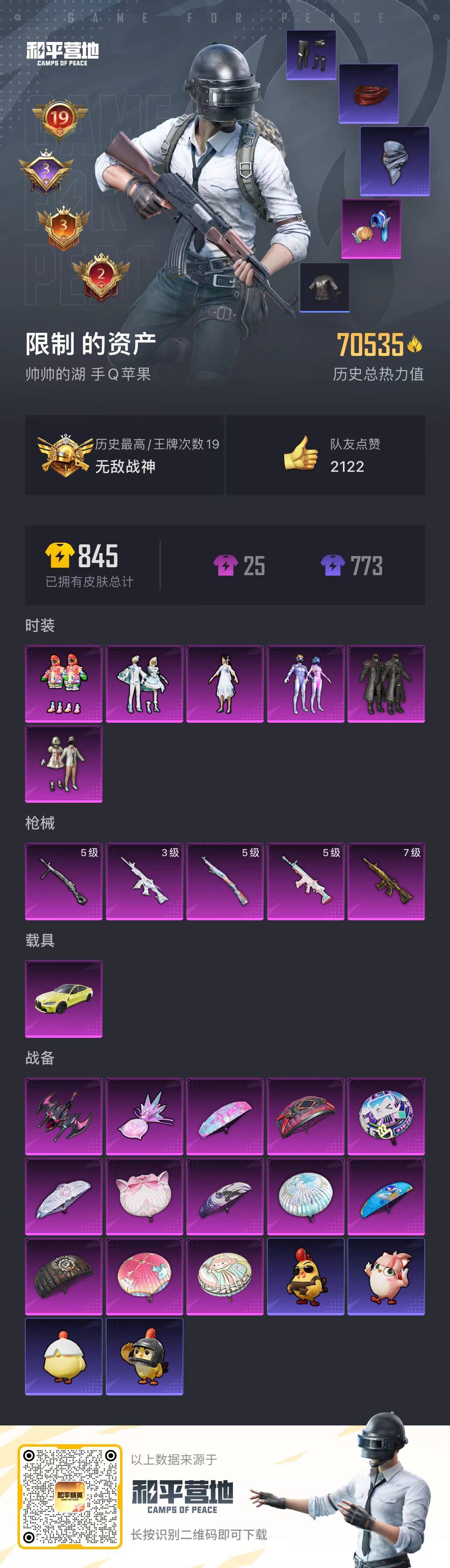 hs60485 苹果手Q-19王牌印记-有战神框-6粉装-5特效枪-1载具-70535热力值-170