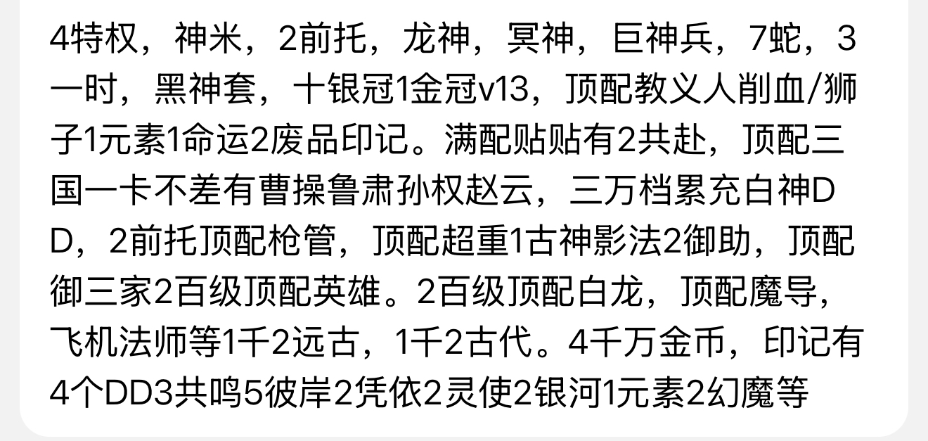 4特权,神米,2前托,龙神,冥神,巨神兵,7蛇,3一时,黑神套,十银冠1金冠v13,顶配教义人削血/狮子1元素1命运2废品印记。满配贴贴有2共赴,顶配三国一卡不差有曹操鲁肃孙权赵云,三万档累充白神DD