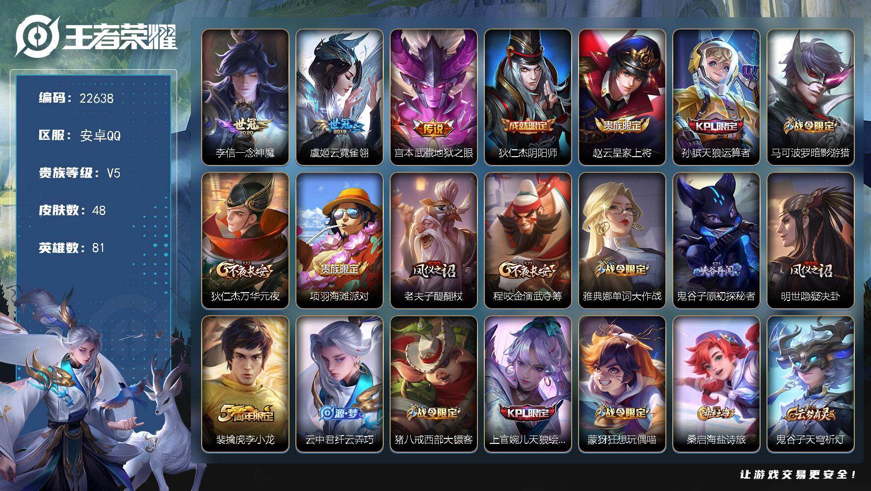 可换绑【特价出售·KPL限定孙膑上官婉儿】五级铭文90 可二次KK8660 安卓Q-V5-48皮肤-3传说-14史诗【传说皮肤】:李信一念神魔,虞姬云霓雀翎,宫本武藏地狱之眼【限定皮肤】:狄仁杰阴阳师,赵云皇家上将,孙膑天狼运算者,马可波罗暗影游猎,狄仁杰万华元夜,项羽海滩派对,老夫子醍醐杖,程咬金演武夺筹,雅典娜单词大作战,鬼谷子原初探秘者,明世隐疑决卦,裴擒虎