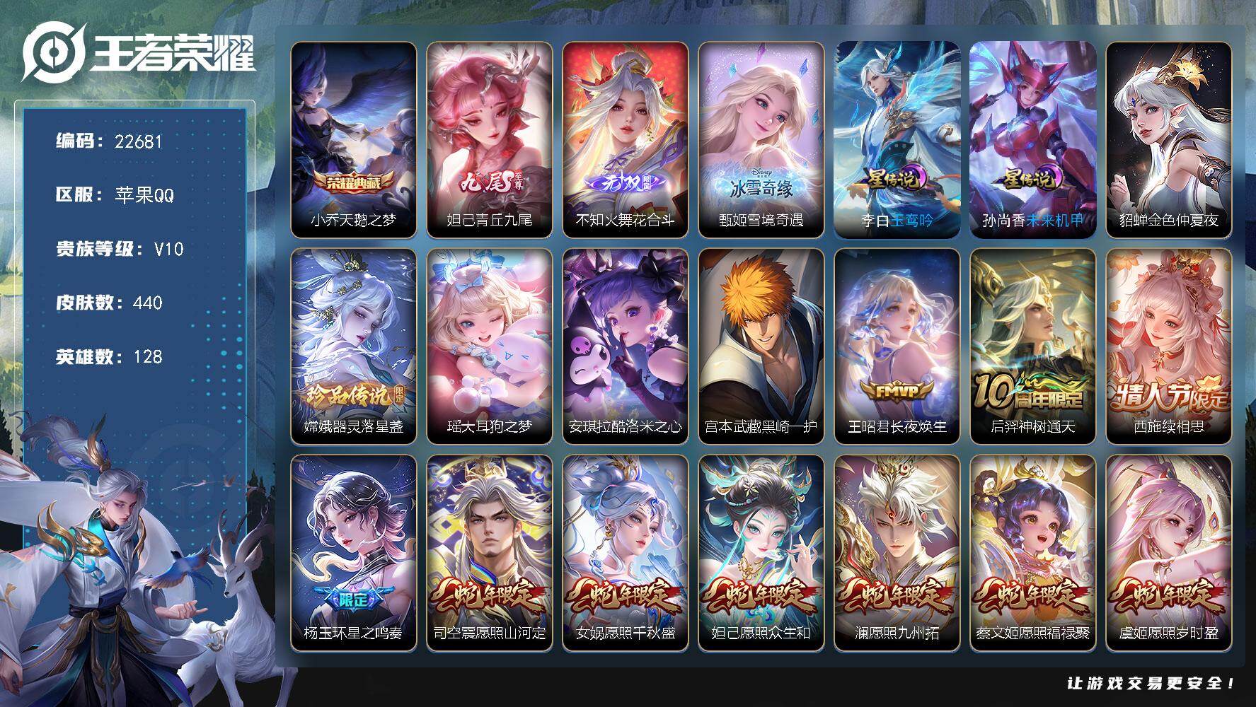 可换绑【极品女号V10精品号·火舞妲己甄姬无双·小乔典藏·安琪拉瑶嫦娥四珍品·朵莉亚心动手记·大乔时之奇旅·至美化雀舞·瑶时之祈愿·遇见胡旋·凤凰于飞·甜蜜冒险天幕·棉花糖聚会天幕·多传说限定妹子号】幸运值267 40按键,3星传说,2天幕,29戳戳,16王者印记,五级铭文170,可二次KK8664,苹果Q-V10-440皮肤-1典藏皮肤-3无双-4珍品传说-47