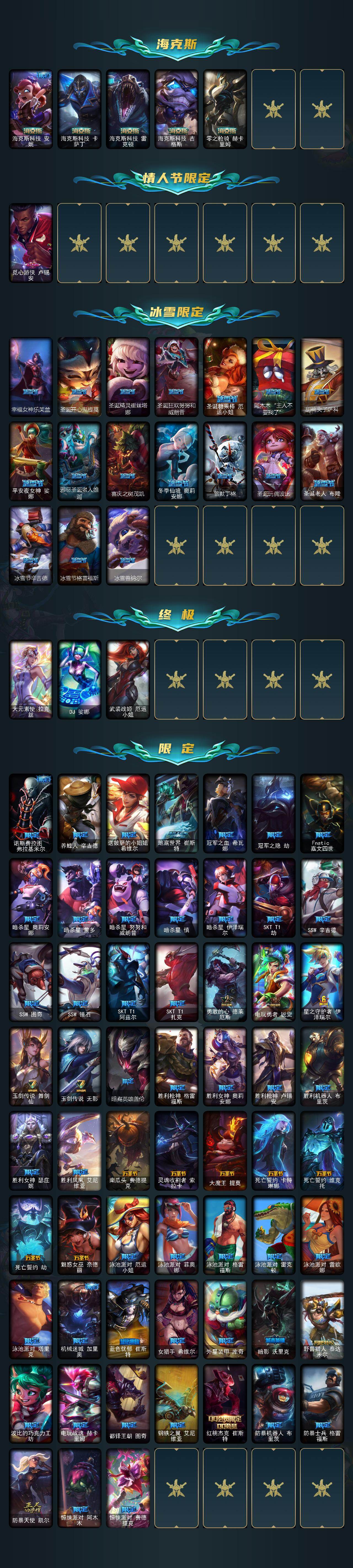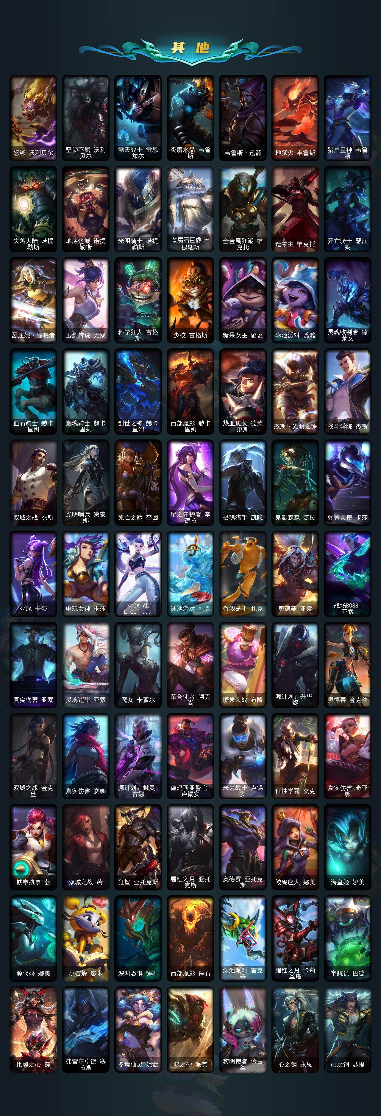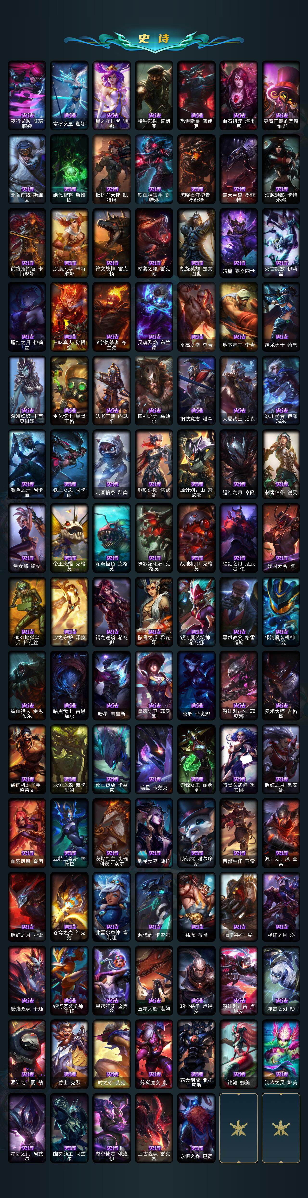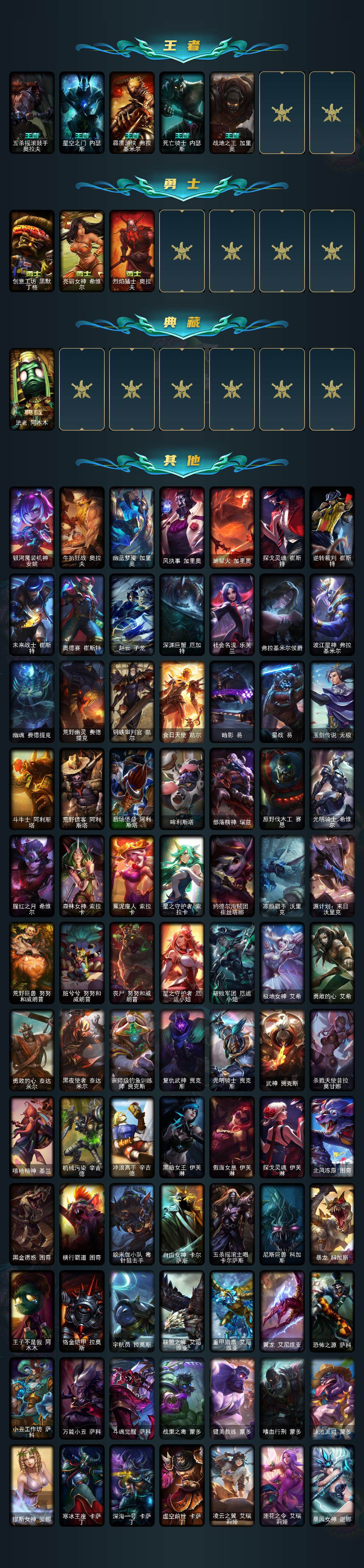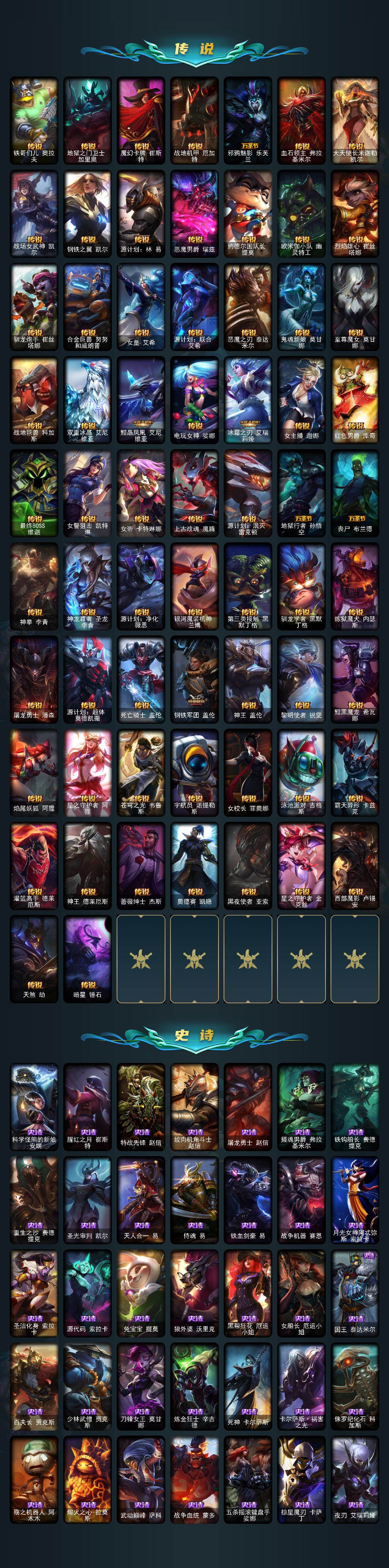172英雄/601皮肤/3终极/30神话/89限定/21臻彩/418炫彩/65传说/138史诗