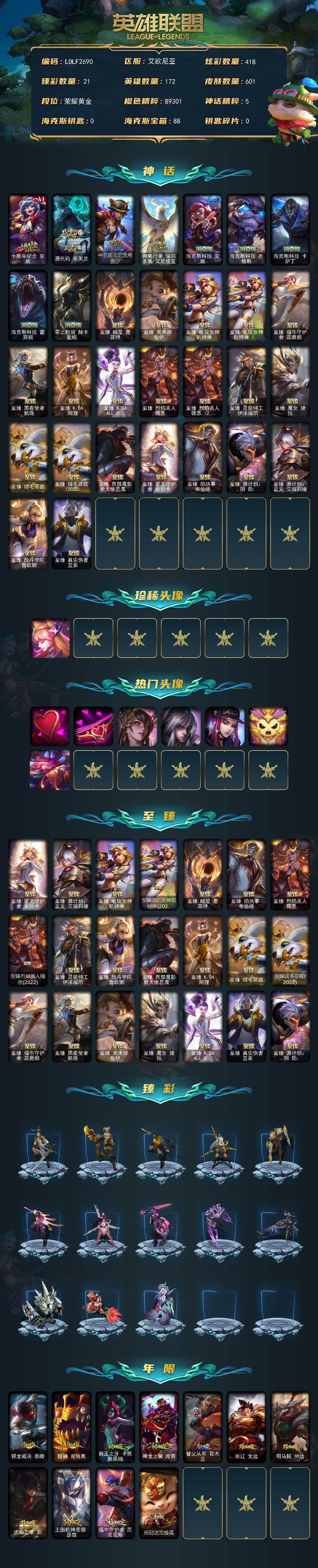 【LOLF2690】172英雄/601皮肤/3终极/30神话/89限定/21臻彩/418炫彩/65传说/138史诗/黄金/十周年纪念安妮/源代码乐芙兰/十五周年纪念希维尔/神凰行者瑞羽圣凰艾尼维亚/海克斯科技安妮/海克斯科技吉格斯/海克斯科技卡萨丁/海克斯科技雷克顿/零之枪骑赫卡里姆/至臻真实伤害亚索/至臻暗星墨菲特/至臻奥术师佐伊/至臻电玩女神凯特琳/至臻电玩女神凯特琳2022/至臻福牛守护者菲奥娜/至臻黑夜使者凯隐/至臻KDA阿狸/至臻KDAALLOUT卡莎/至臻烈焰美人薇恩/至臻烈焰美人薇