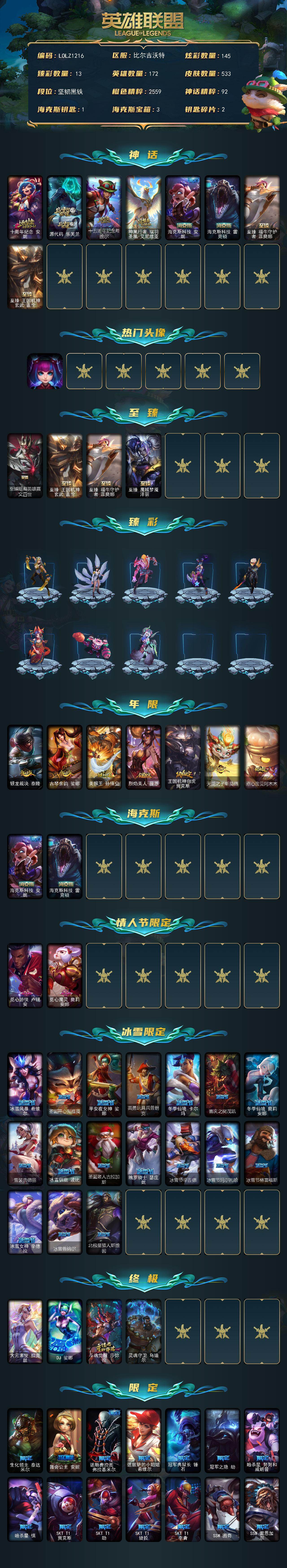 【LOLZ1216】172英雄/533皮肤/4终极/10神话/89限定/13臻彩/145炫彩/47传说/130史诗/未定级/十周年纪念安妮/源代码乐芙兰/十五周年纪念希维尔/神凰行者瑞羽圣凰艾尼维亚/海克斯科技安妮/海克斯科技雷克顿/至臻福牛守护者菲奥娜/至臻王国机神玄武盖伦/银河魔装机神安妮头像/至臻暗裔英雄嘉文四世/至臻魔域梦魇泽丽/天龙之子卡莎飞龙乘云/墨之影武者亚索金墨耀影/闭月之颜貂蝉炫金莲华/偶像歌手阿狸极地雪莲/神龙尊者圣龙李青登龙/星之守护者金克丝黑洞/源计划火菲奥娜惩戒/灵魂莲