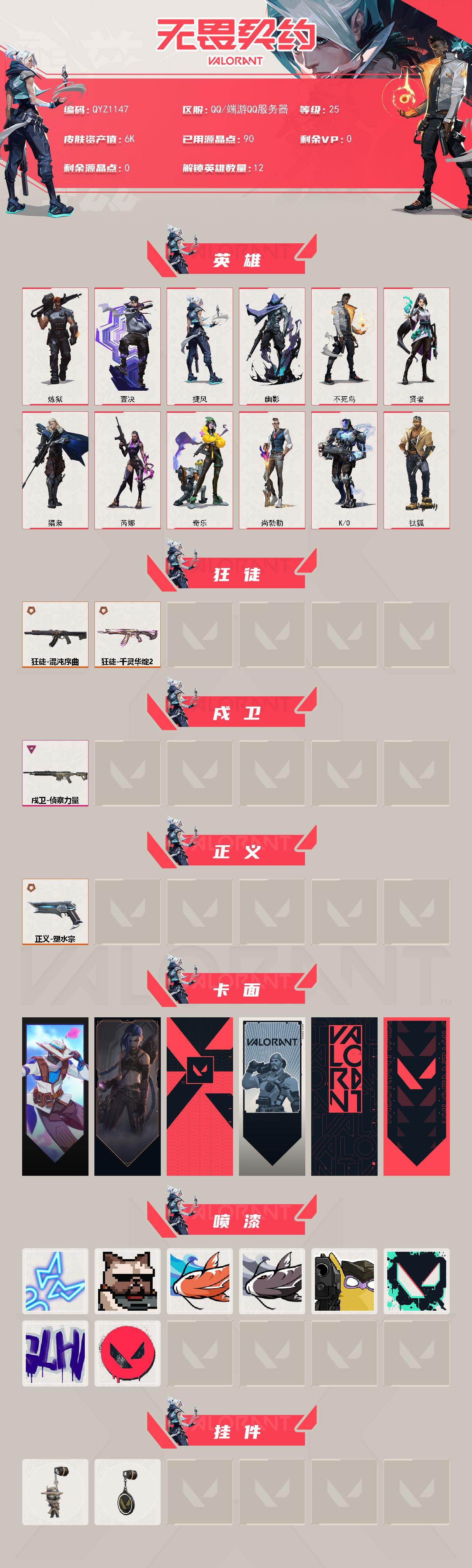 【QYZ1147】终极*3/卓越*1/皮肤*4/等级*25/段位:黑铁/炼狱/钛狐/壹决/捷风/幽影/不死鸟/贤者/猎枭/芮娜/奇乐/尚勃勒/K/O/狂徒-混沌序曲/狂徒-千灵华绽//2.0/戍卫-侦察力量/正义-塑水宗/无畏契约GO!第一卷:零 卡面/《双城之战》金克丝 卡面/代号红色 卡面/新兵报到 卡面/V契约 卡面/无畏契约 卡面/霓光四射 喷漆/关门放狗 喷漆/红鳞 喷漆/松叶 喷漆/放下武器 喷漆/胜利属于无畏契约 喷漆/GLHF 喷漆/无畏契约 喷漆/无畏契约GO!第一卷 零 挂饰