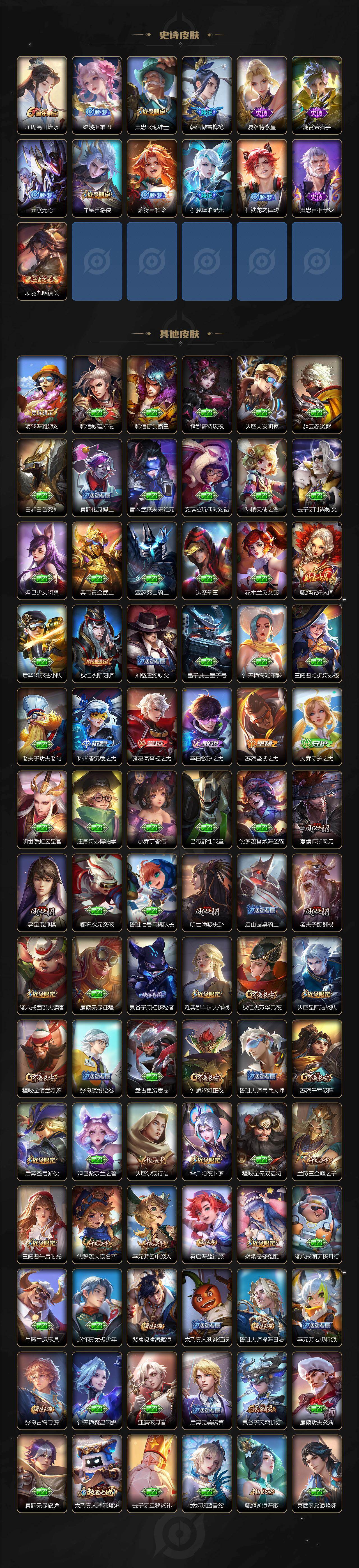 【传说皮肤】:夏洛特浮生妄,孙悟空齐天大圣,曜山海苍雷引,李信山海炽霜斩,吕布怒海麟威,李白诗剑行,马超无双飞将,赵云淬星耀世,诸葛亮时雨天司,虞姬启明星使,关羽武圣,曜云鹰飞