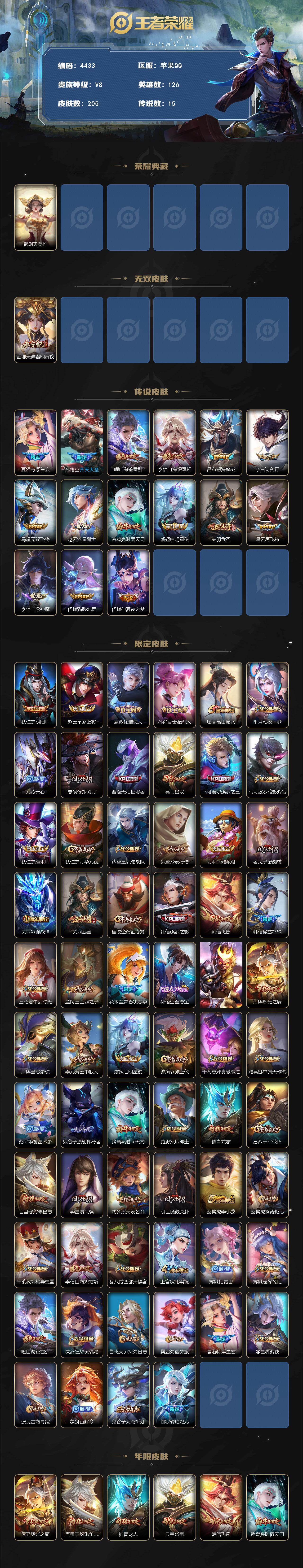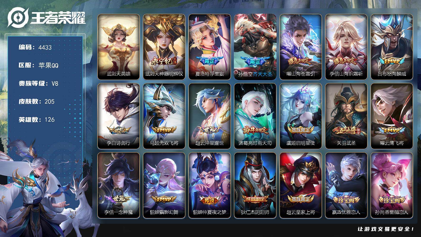 苹果Q-V8-永恒钻石IV段位-126英雄-205皮肤-1典藏英雄-1无双-1
