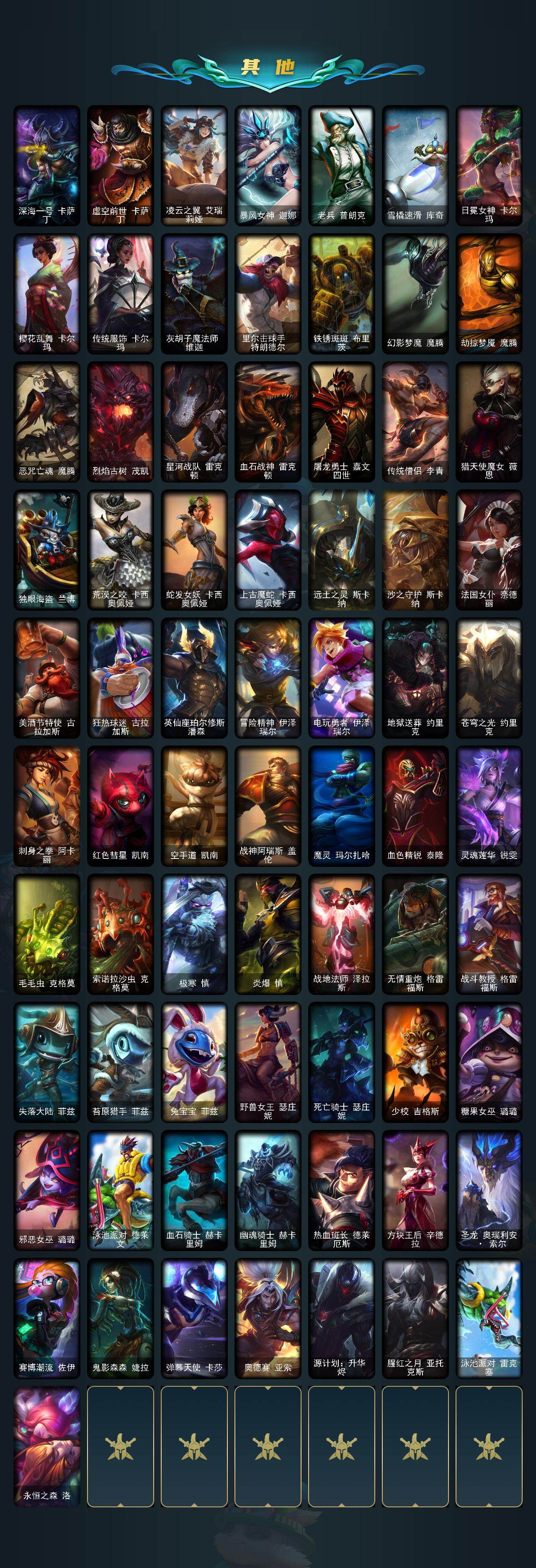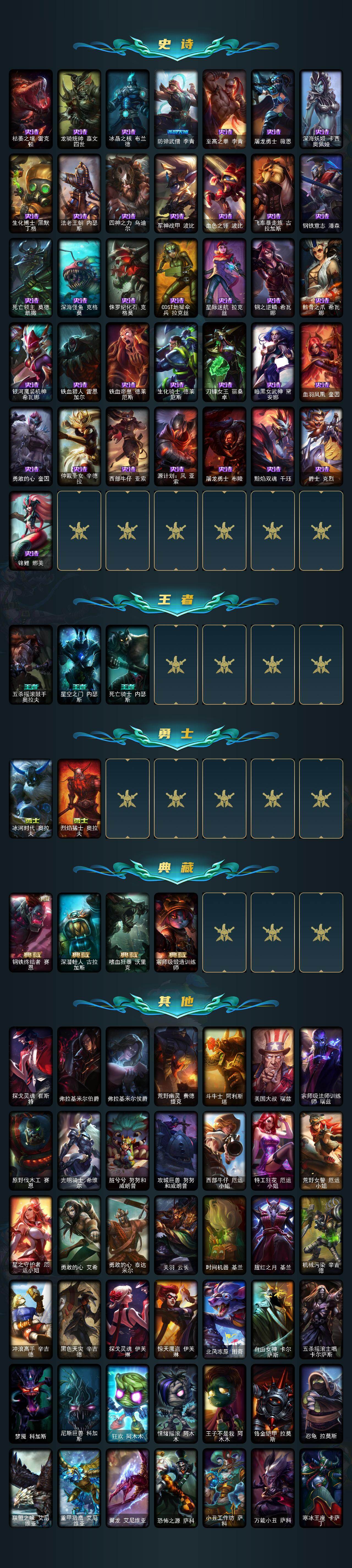 130英雄/233皮肤/2神话/26限定/3臻彩/13炫彩/19传说/64史诗/未定级