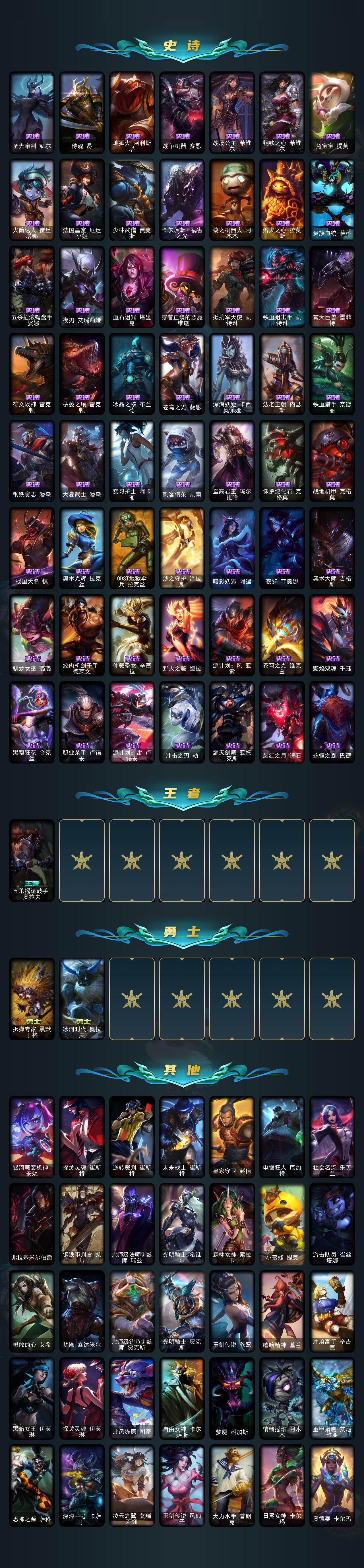172英雄/201皮肤/1终极/5神话/31限定/19炫彩/22传说/56史诗