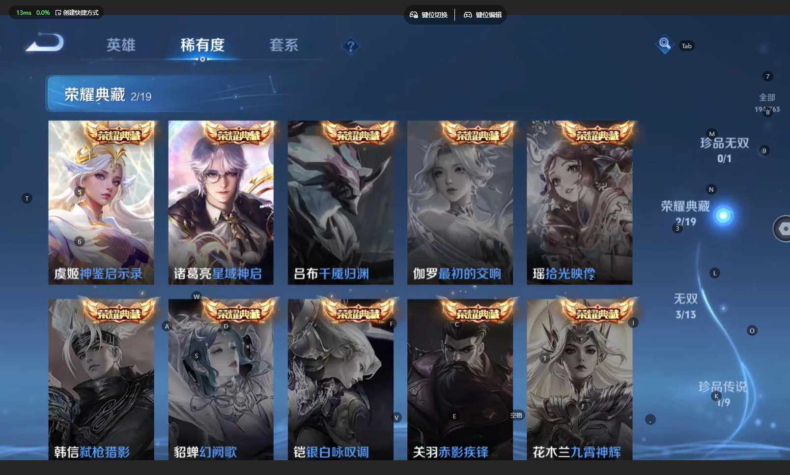 安卓WX-V8-荣耀黄金II段位-127英雄-194皮肤-2典藏皮肤-3无双-1珍品传说-13传说-47限定-15按键