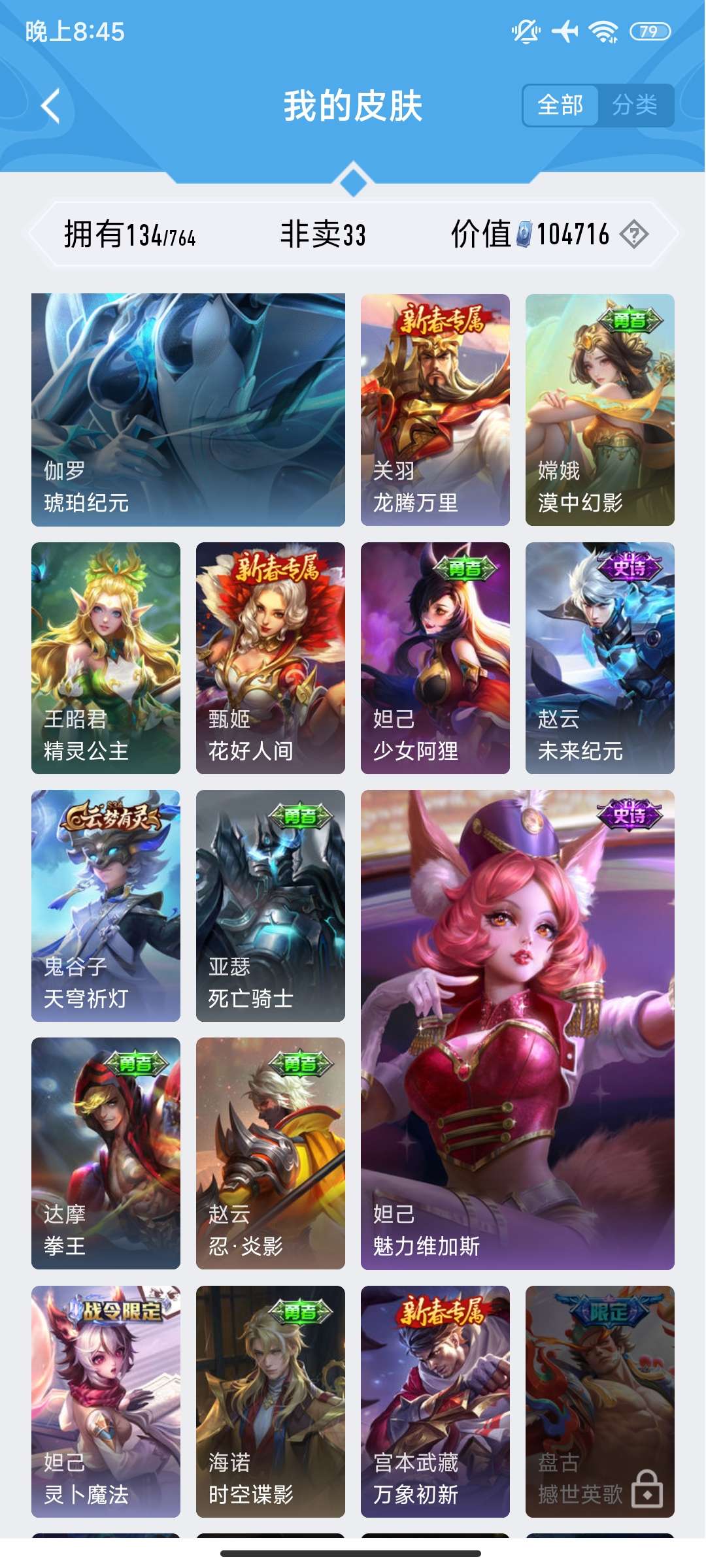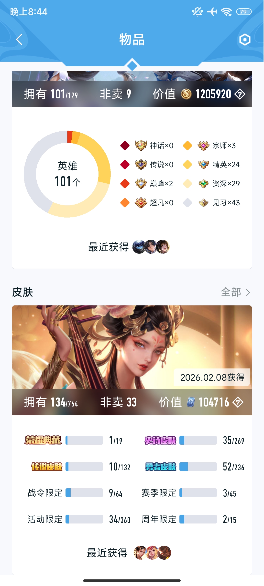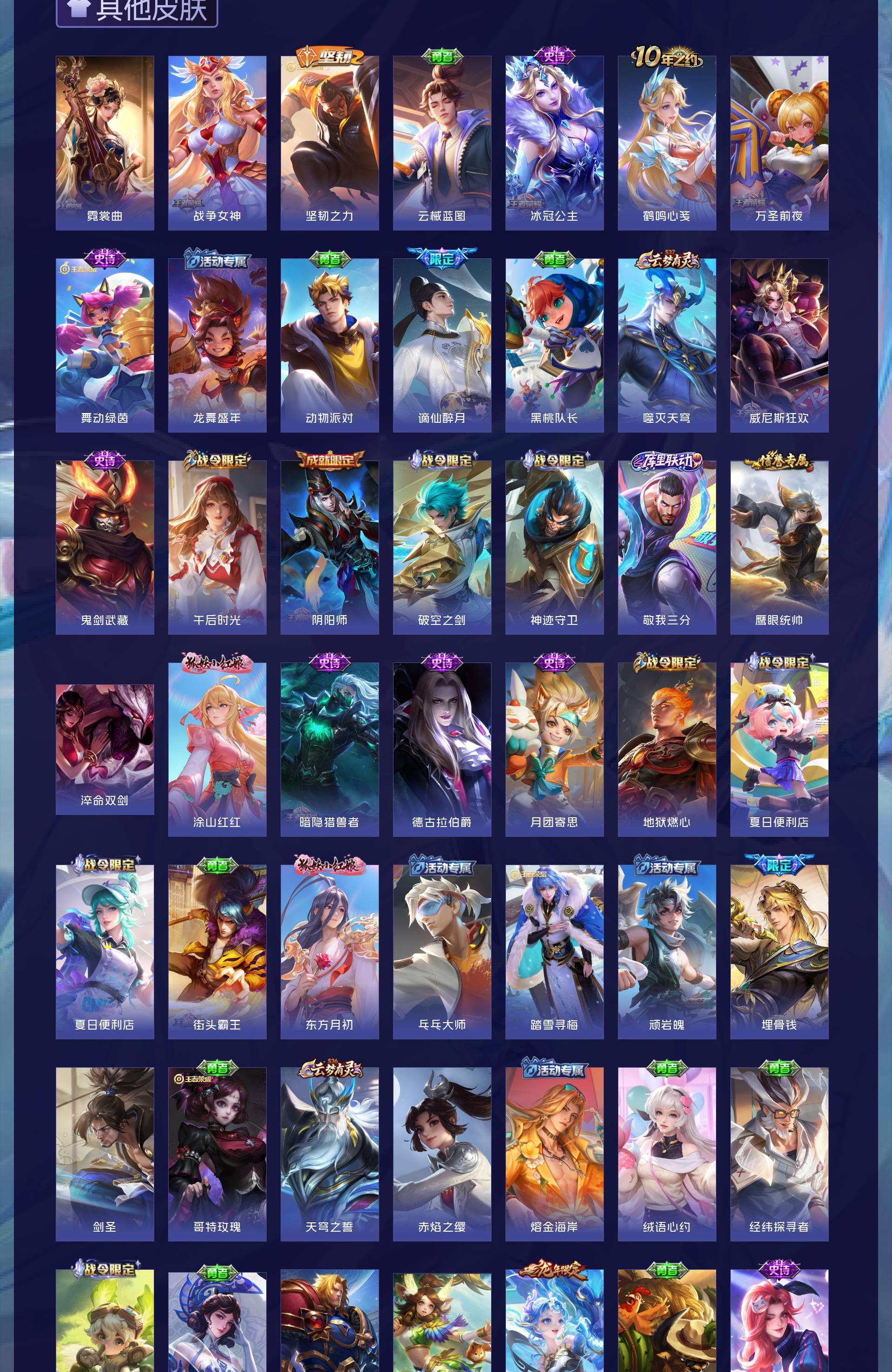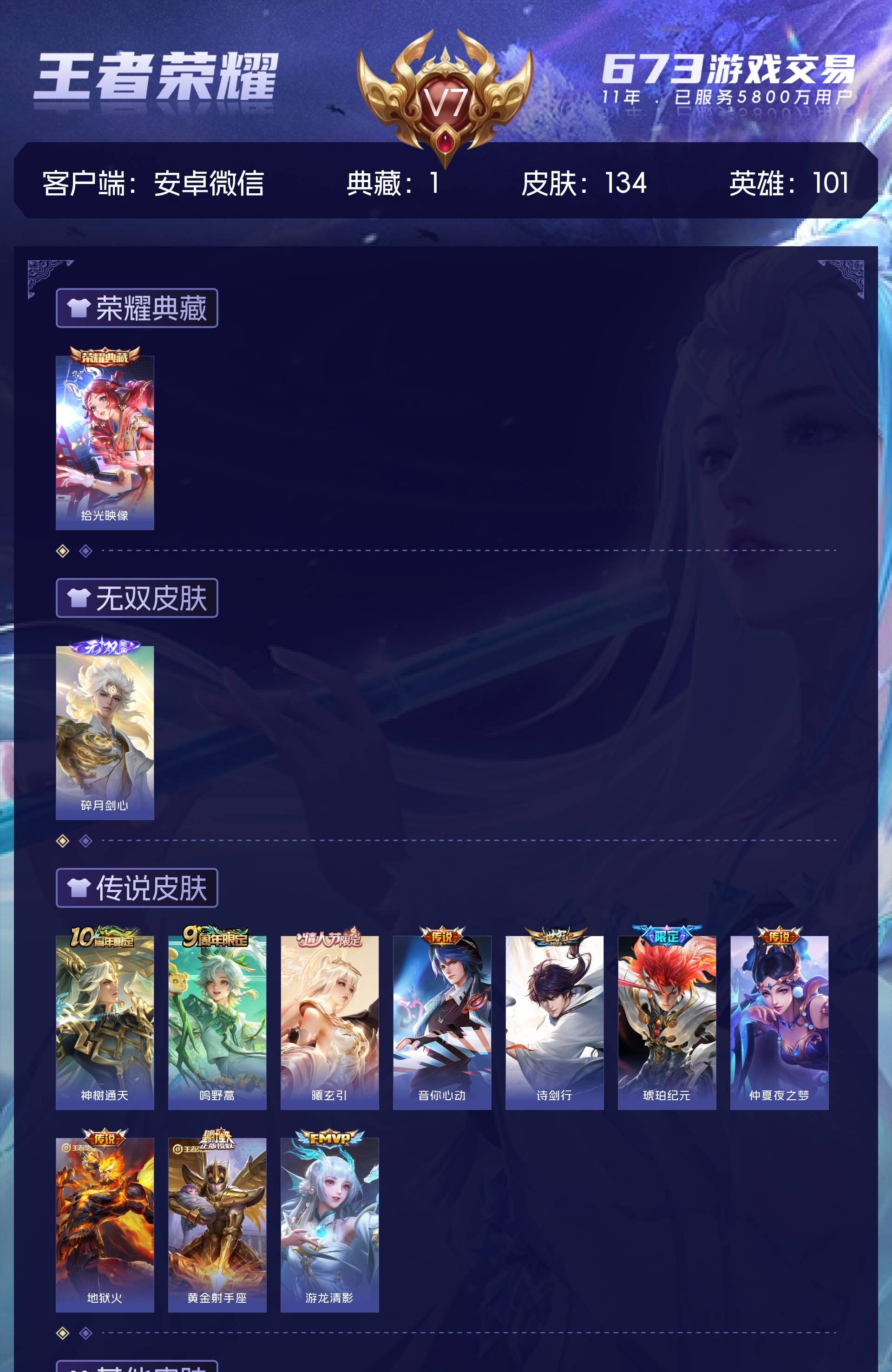V7 皮肤134 英雄101 永恒钻石 荣耀典藏1 无双皮肤1 传说10 其他皮肤128