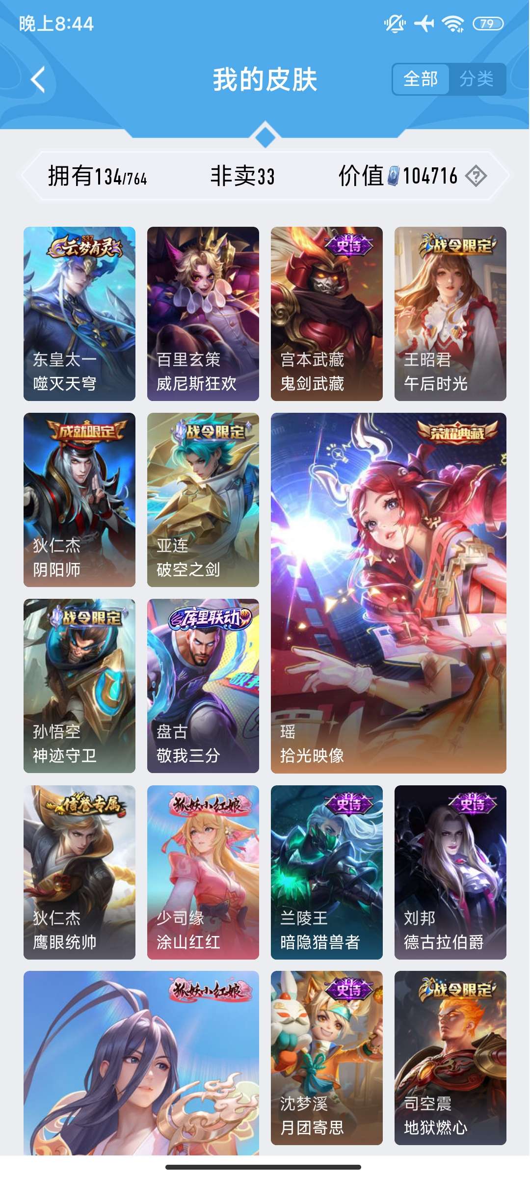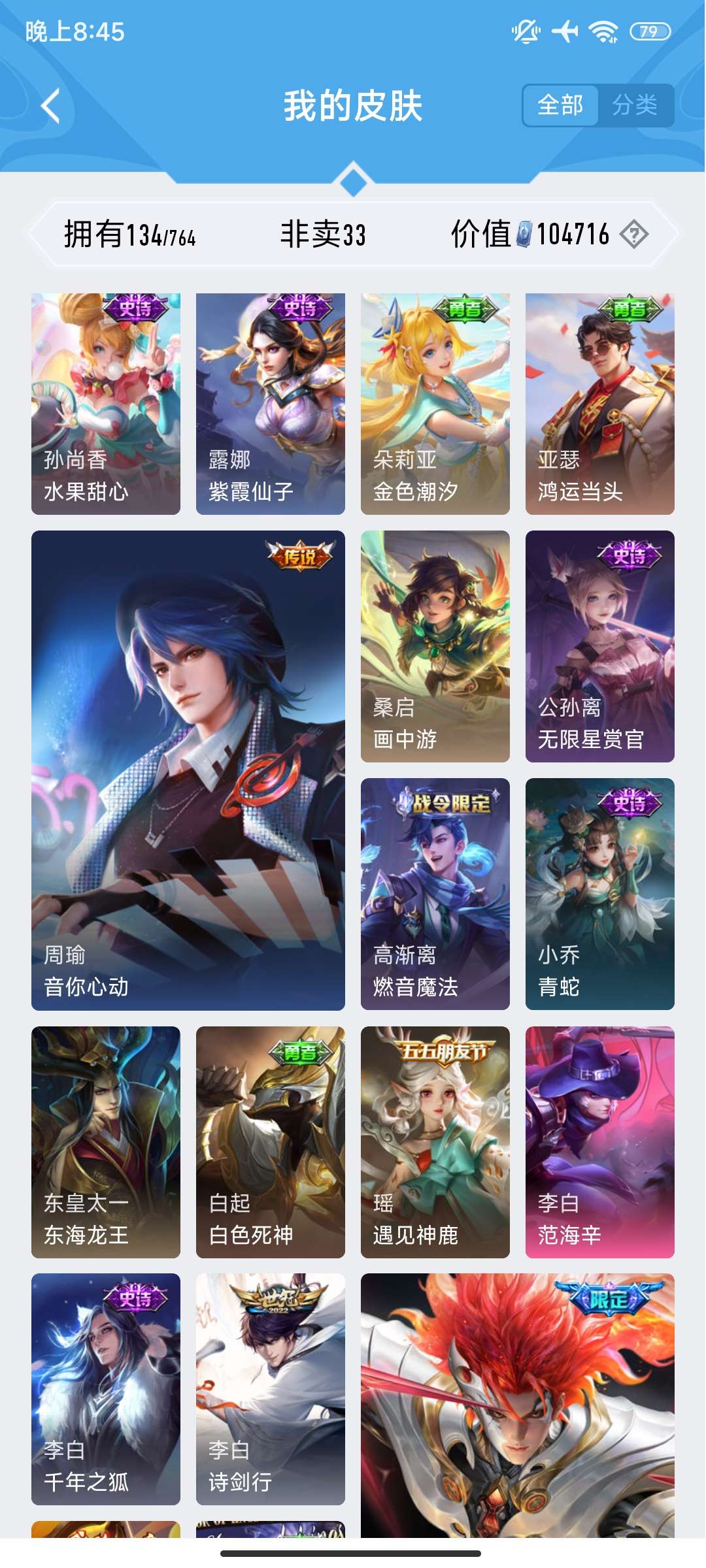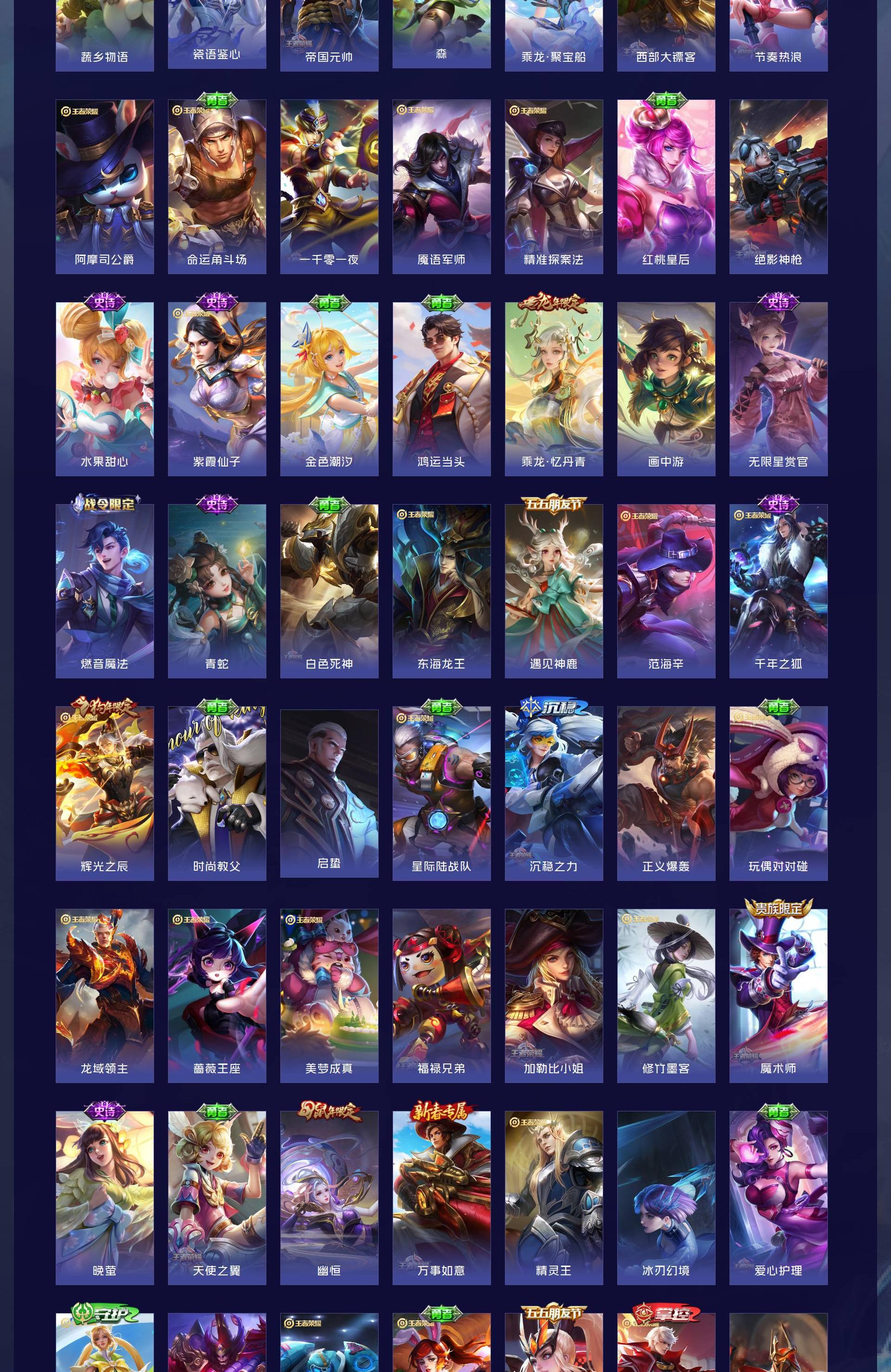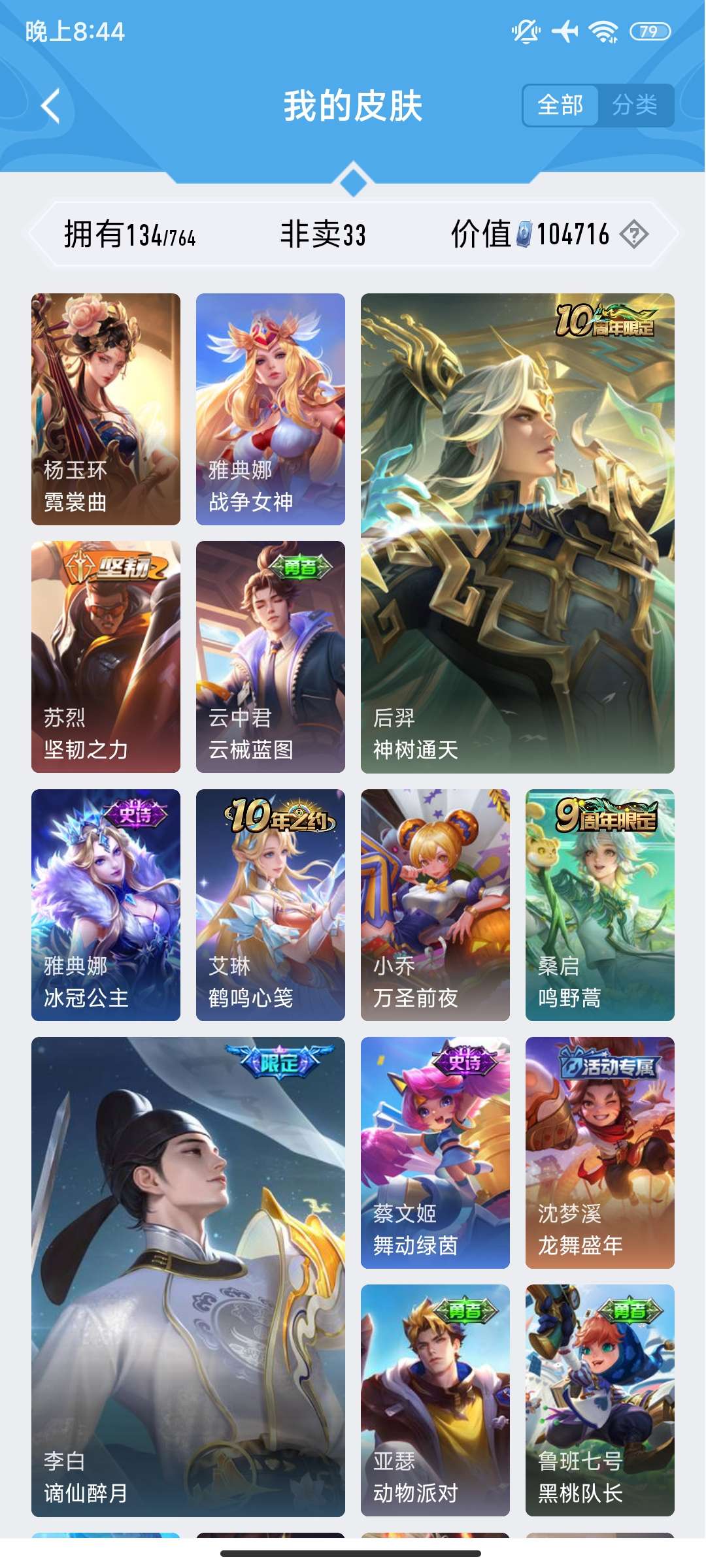 V7 皮肤134 英雄101 永恒钻石 荣耀典藏1 无双皮肤1 传说10 其他皮肤128