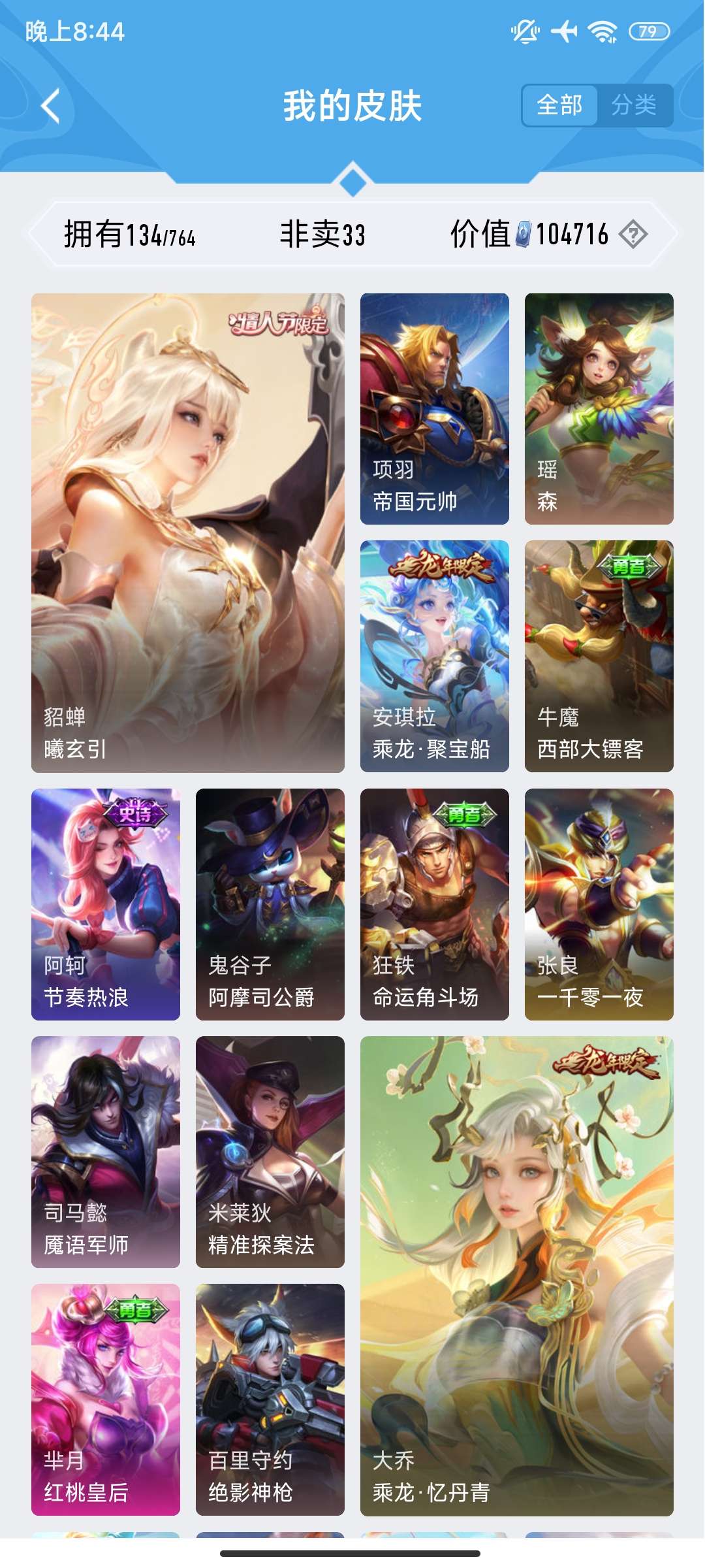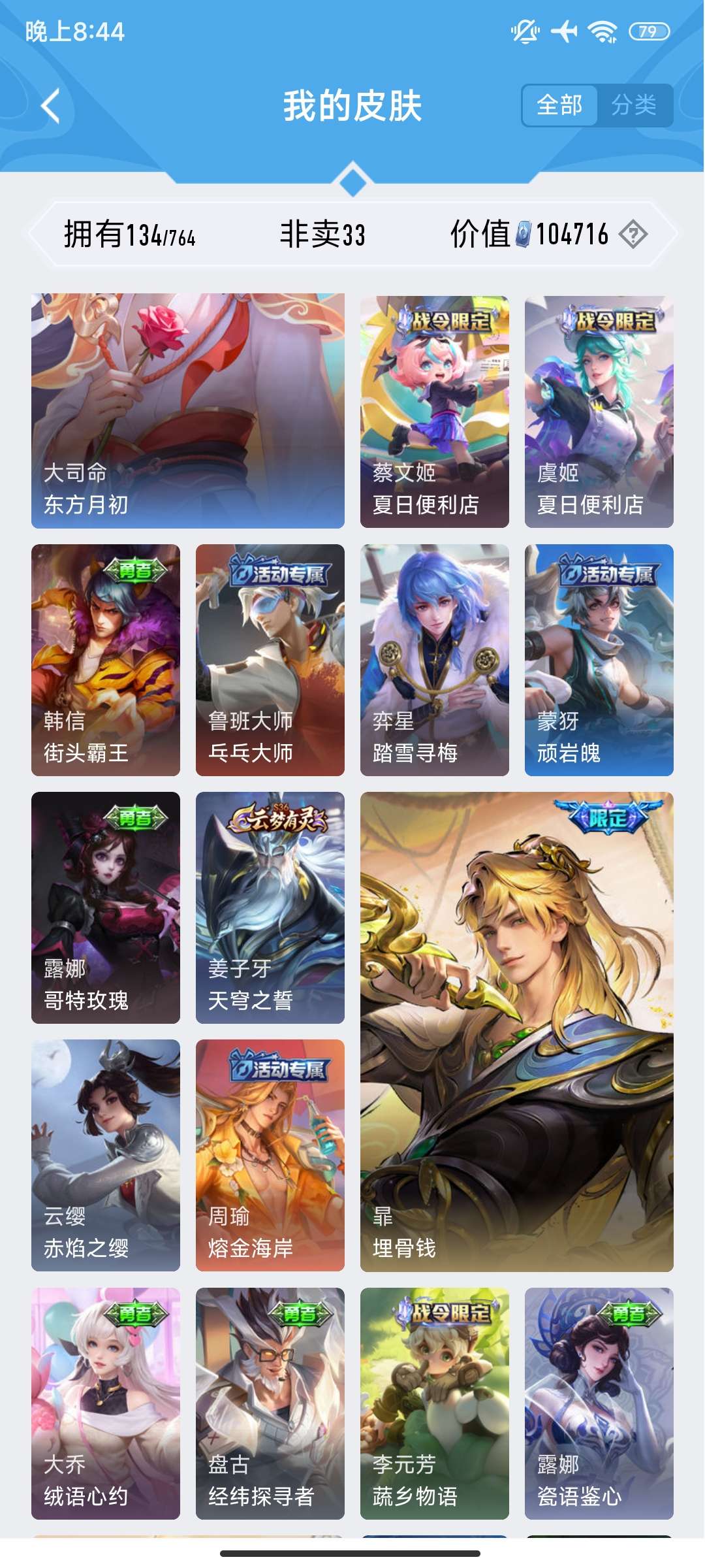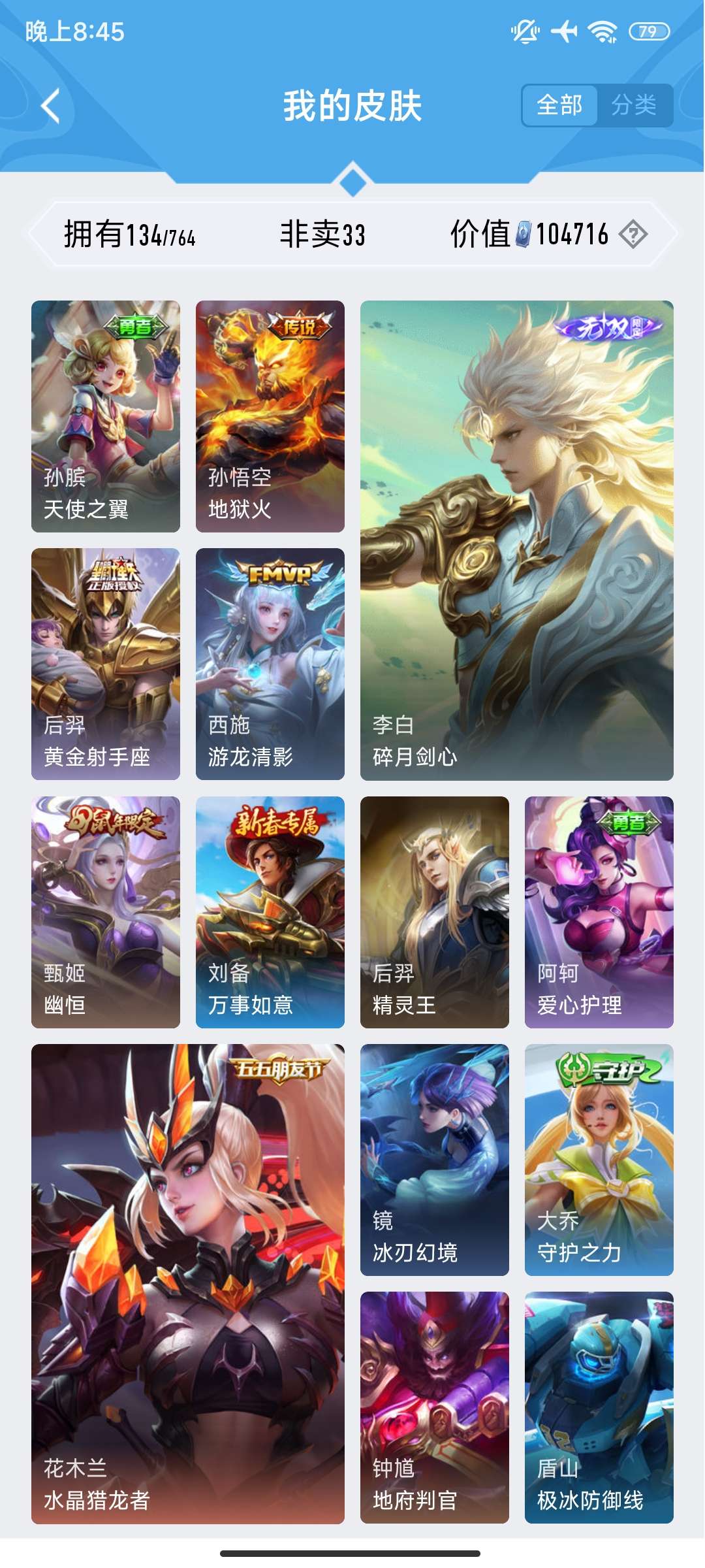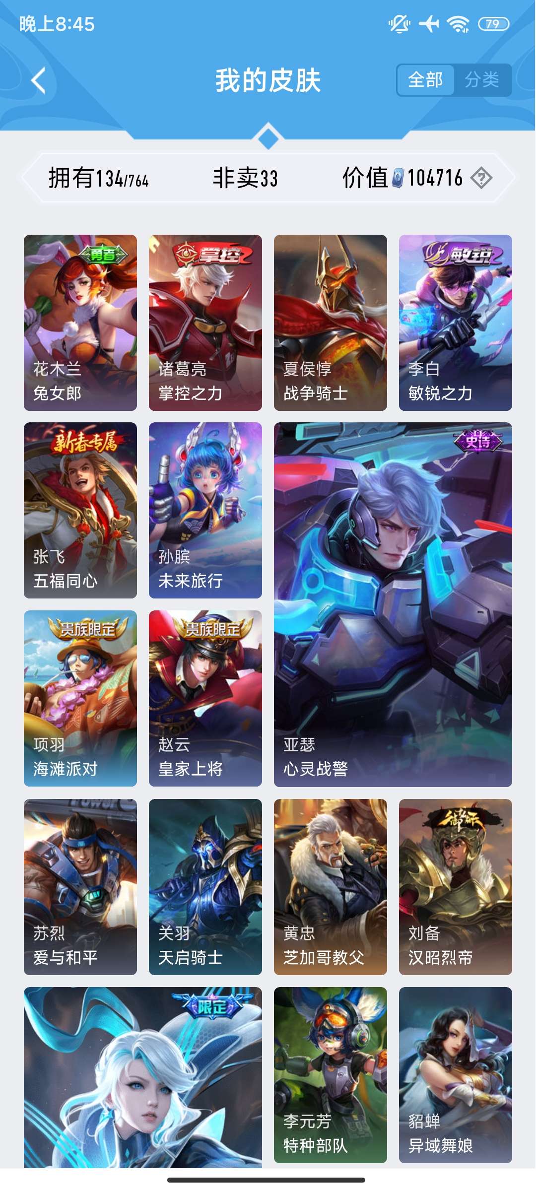 V7 皮肤134 英雄101 永恒钻石 荣耀典藏1 无双皮肤1 传说10 其他皮肤128