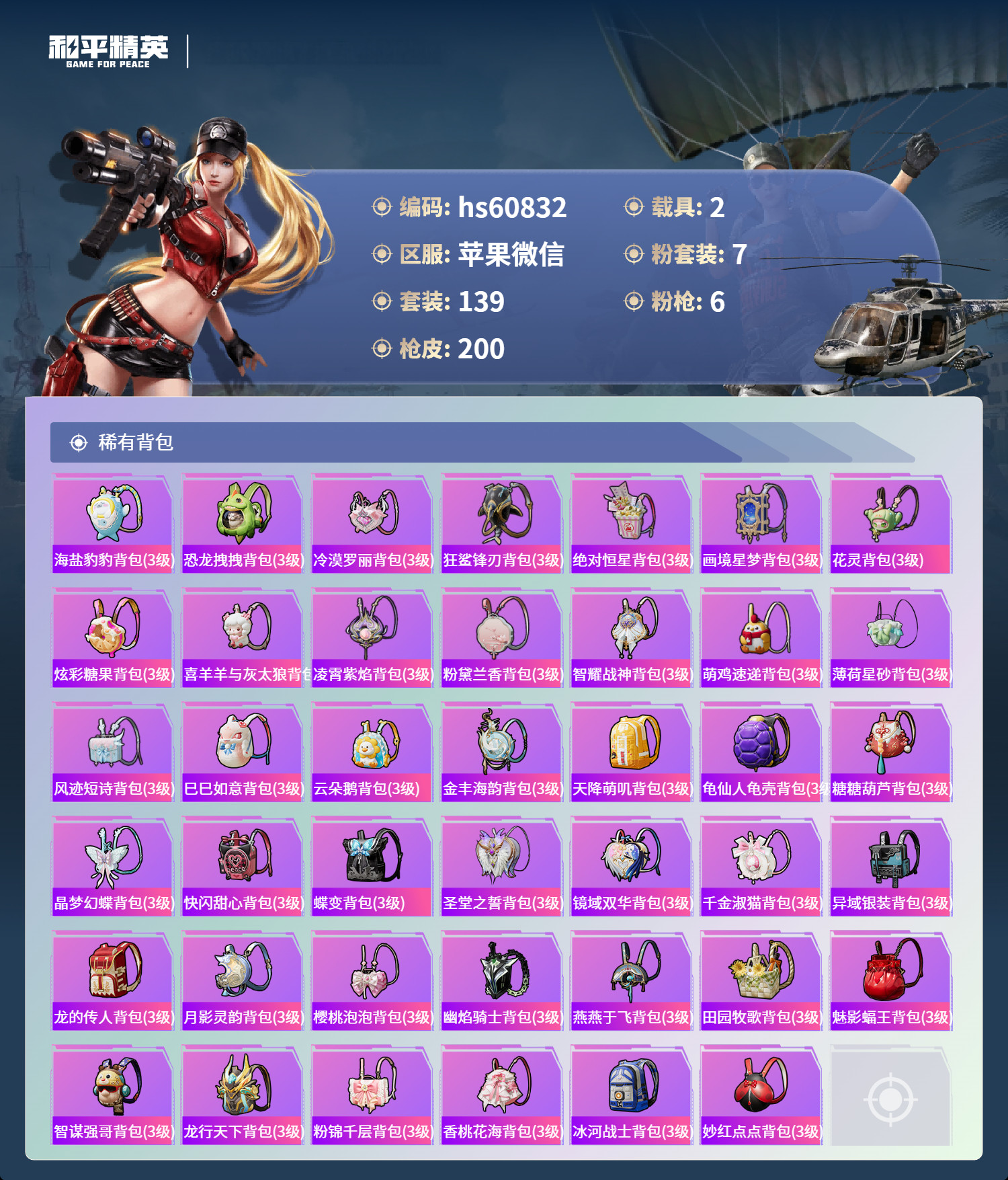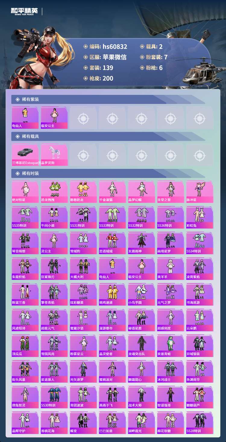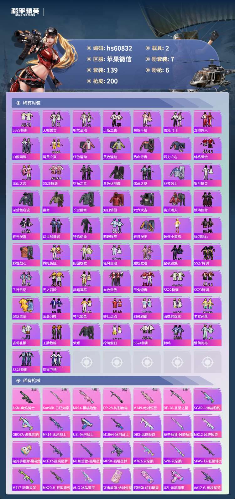 hs60832 苹果微-14王牌印记-7粉装-6特效枪-2载具-65876热力值-139套装-20