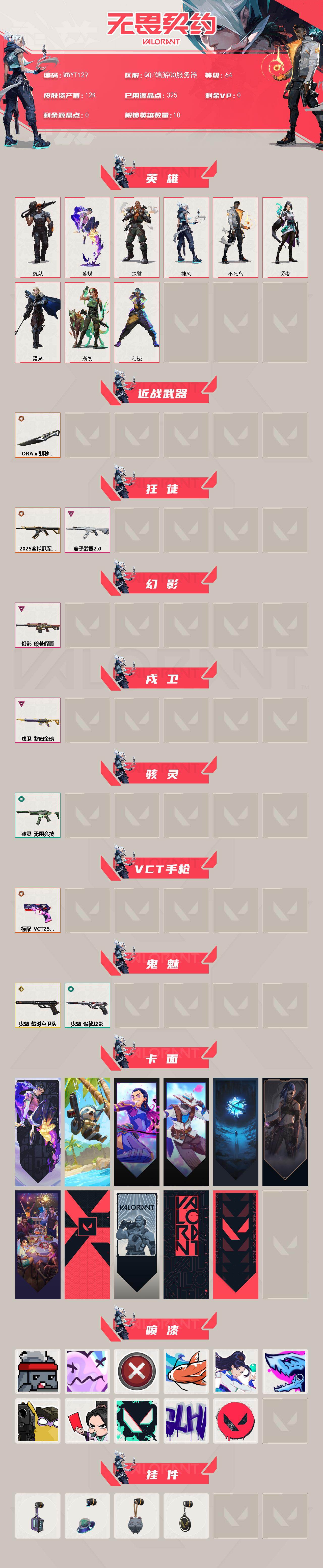 【WWYT129】终极*4/传奇*1/卓越*3/皮肤*22/等级*64/段位:未定级/幻棱/炼狱/暮蝶/铁臂/捷风/不死鸟/贤者/猎枭/斯凯/近战武器-ORA x 颗秒 军刀/狂徒-2025全球冠军赛/狂徒-离子武器//2.0/幻影-般若假面/戍卫-紫阙金琅/骇灵-无限竞技/标配-VCT25 x PRX/鬼魅-超时空卫队/鬼魅-诡秘蛇影/无畏契约:暮蝶 卡面/树懒大作战 卡面/无畏契约GO!第一卷:芮娜 卡面/无畏契约GO!第一卷:零 卡面/无垠星环 卡面/《双城之战》金克丝 卡面/天台狂欢 卡