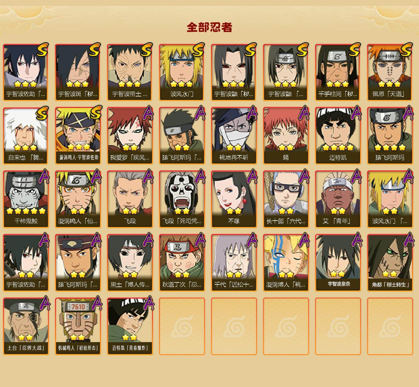 【HYX3582】V5/S忍10/A忍25/疾风传-我爱罗/死司凭血-飞段/永恒万花筒-宇智波佐助/秽土转生-宇智波鼬/桃地再不斩/忍界大战-宇智波带土/蝎/天道-佩恩/3星漩涡鸣人·宇智波佐助/波风水门/忍界大战-秋道丁次/秽土转生-猿飞阿斯玛/2星角都「秽土转生」/桃式显现-漩涡博人/秽土转生-千手柱间/2星土台「忍界大战」/六代目水影-长十郎/青年-波风水门/4星猿飞阿斯玛/舞之豪杰-自来也/4星迈特凯/四代目土影-黑土/飞段/仙人模式-漩涡鸣人/2星宇智波泉奈/秽土转生·解-宇智波斑/青