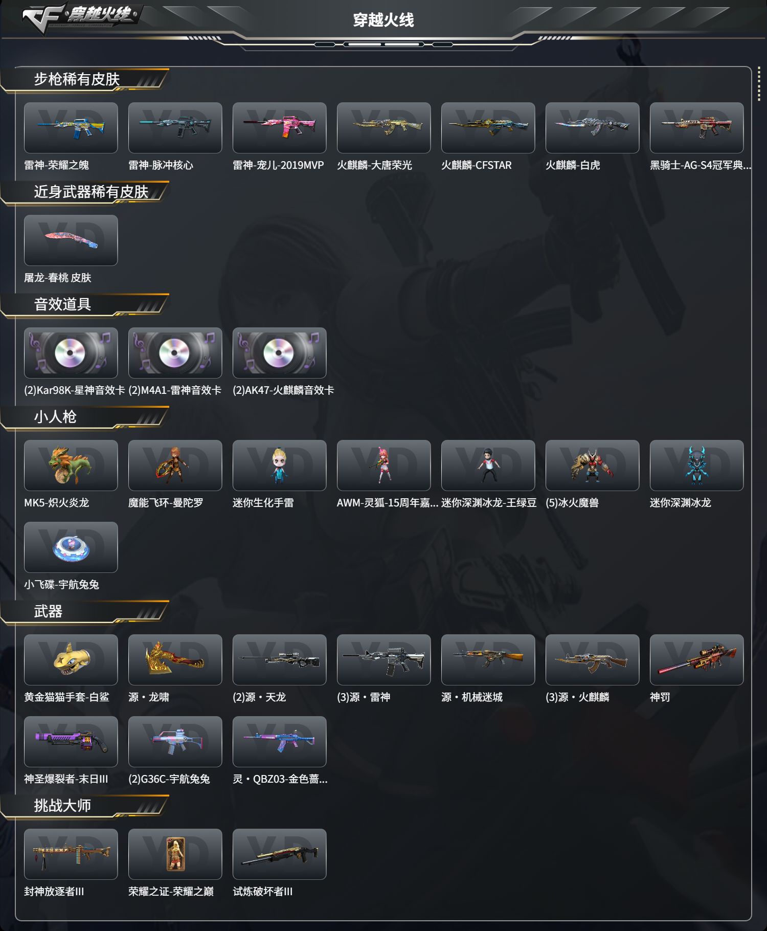 【V武器】M200-幻神,Kar98K-星神,G36C-幻影,Scar Light-白虎,QBZ03-云龙,汤姆逊-烈龙,烈龙-云海游龙,柯尔特-冠军之特,COP 357-云龙,COP 357-幻灵,Knife-冠军之刃,炽芒蝶刃,M4A1-雷神,M4A1-黑骑士,M4A1-青龙,AK47-火麒麟,黑武士-锦绣游龙,沙鹰-修罗,屠龙,龙啸,幻灵之锋,