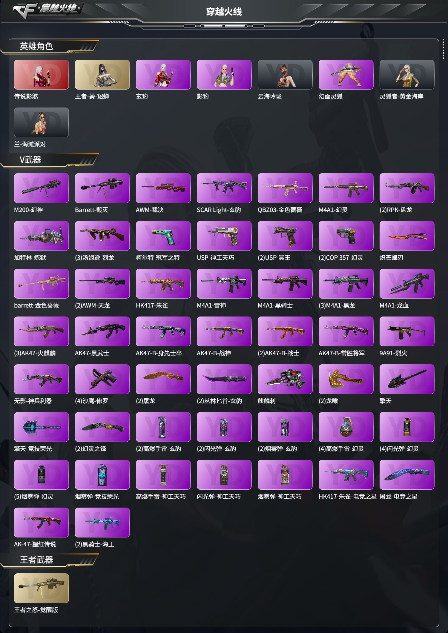 四防影煞/幻神+音效卡+宠儿+CFS/冠军之特/USP神工天巧/幻灵套/炽芒蝶刃/SCAR玄豹/USP冥王*2/裁决带皮/QBZ带皮/毁灭三件套/雷神三件套/黑骑士三件套/2盘1炼狱/3烈/