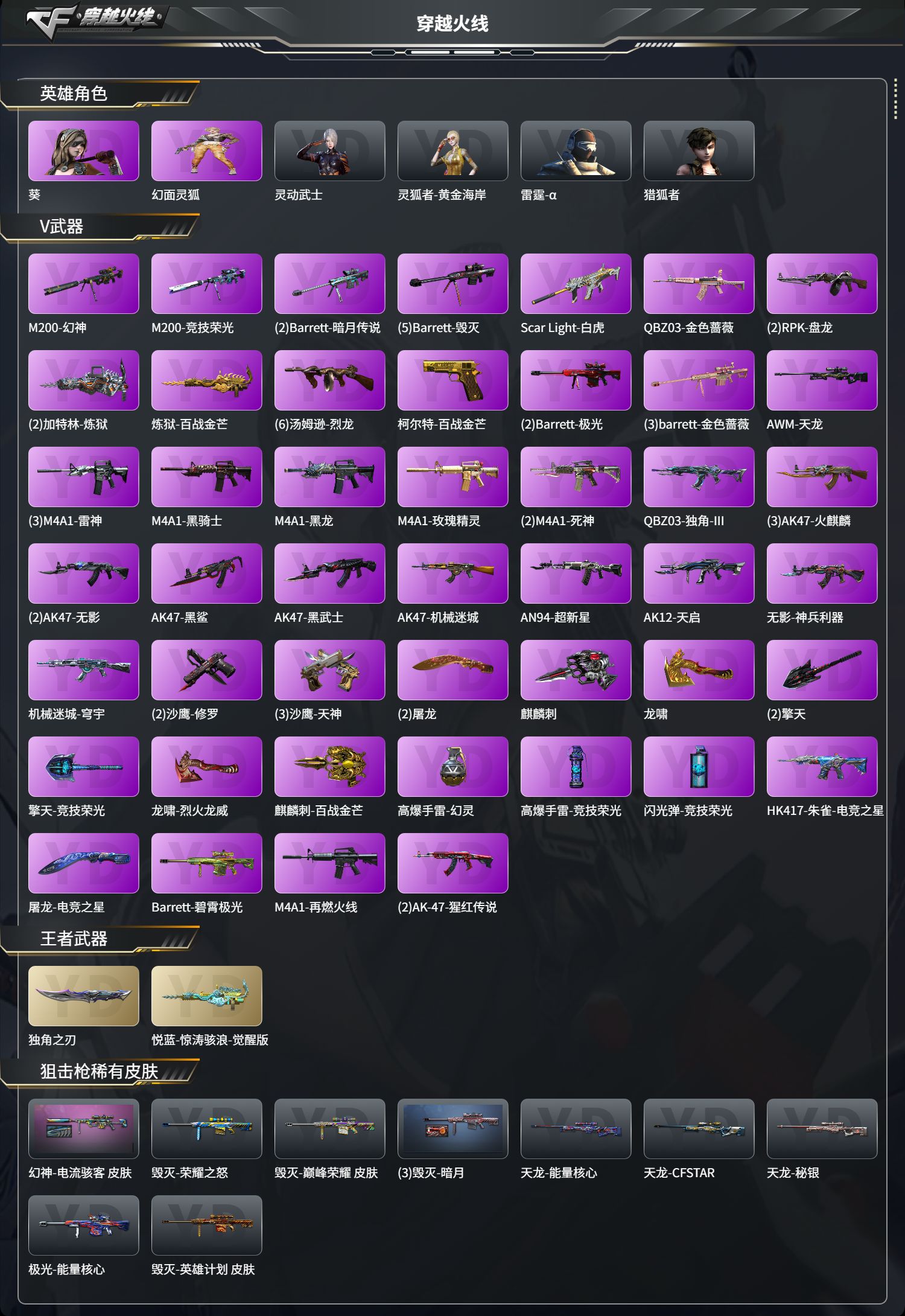 【V武器】M200-幻神,M200-竞技荣光,Barrett-暗月传说,Barrett-毁灭,Scar Light-白虎,QBZ03-金色蔷薇,RPK-盘龙,加特林-炼狱,炼狱-百战金芒,汤姆逊-烈龙,柯尔特-百战金芒,Barrett-极光,ba