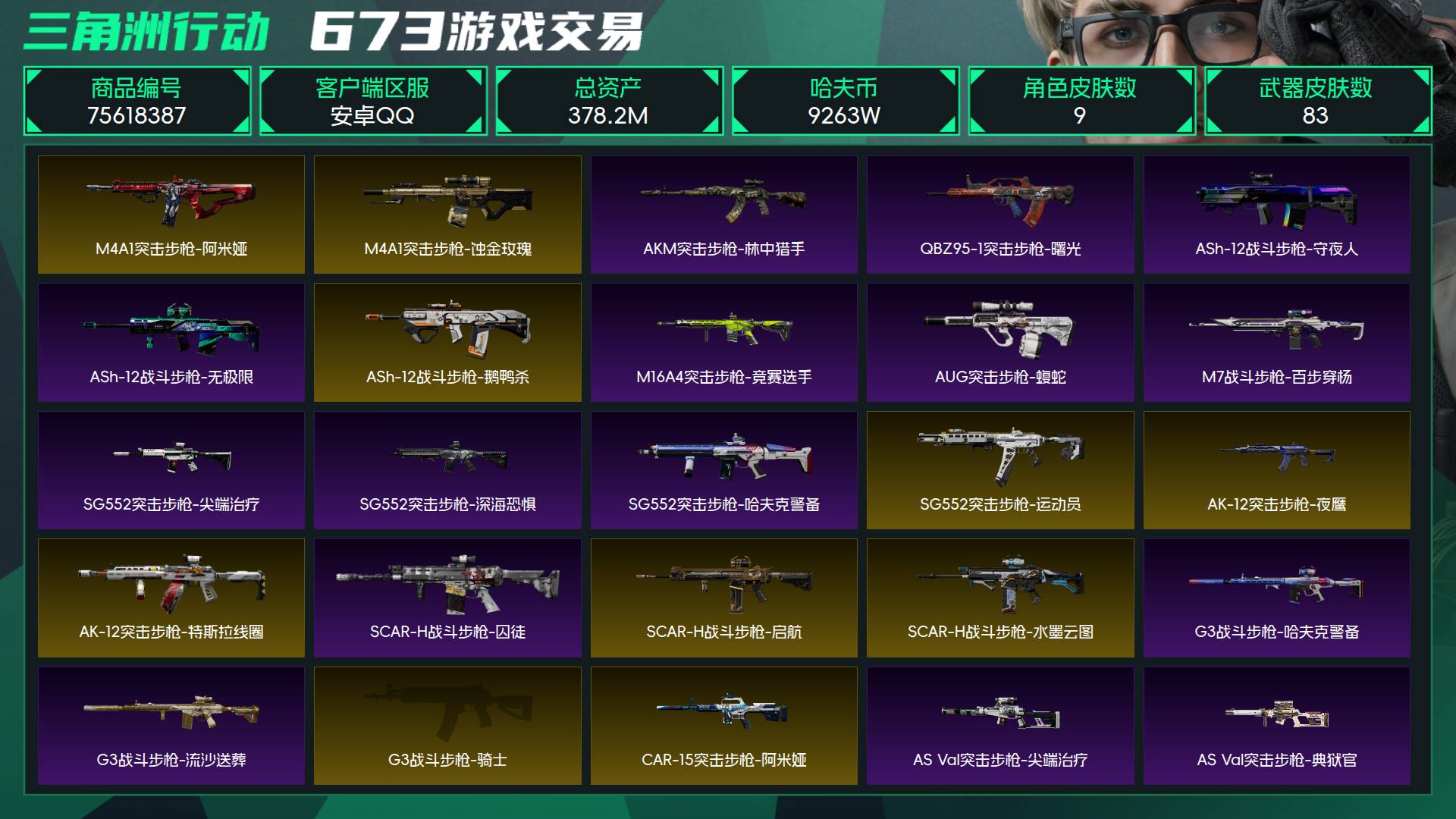 烽火段位钻石4 战场段位上等兵2 总资产378.2M 哈夫币9263W 干员9 挂饰23 近战3 枪械83 载具31