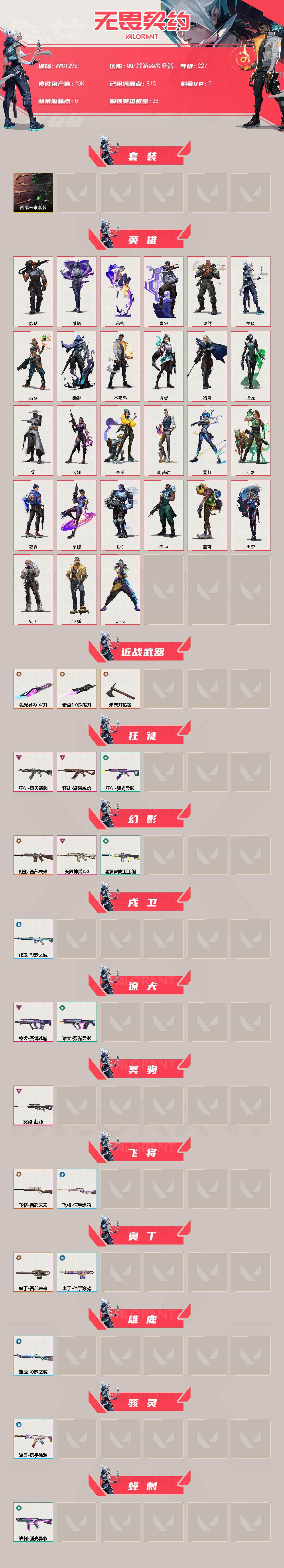 【WWC1298】终极*10/卓越*5/皮肤*38/等级*227/段位:黄金/西部未来套装/幻棱/炼狱/维斯/暮蝶/钛狐/壹决/铁臂/捷风/雷兹/幽影/不死鸟/贤者/猎枭/蝰蛇/零/芮娜/奇乐/尚勃勒/霓虹/斯凯/夜露/星礈/K/O/海神/盖可/黑梦/钢锁/近战武器-奇点//2.0 蝴蝶刀/近战武器-未来开拓者/近战武器-弧光异彩 军刀/狂徒-堕天遗武/狂徒-耀鳞威龙/狂徒-弧光异彩/幻影-西部未来/幻影-天界神兵//2.0/幻影-噬源兽防卫工程/戍卫-彩梦之城/獠犬-赛博迷城/獠犬-弧光异彩/