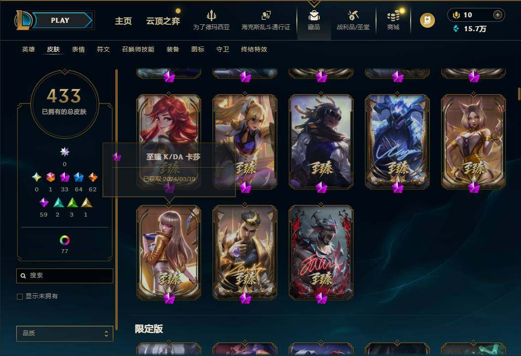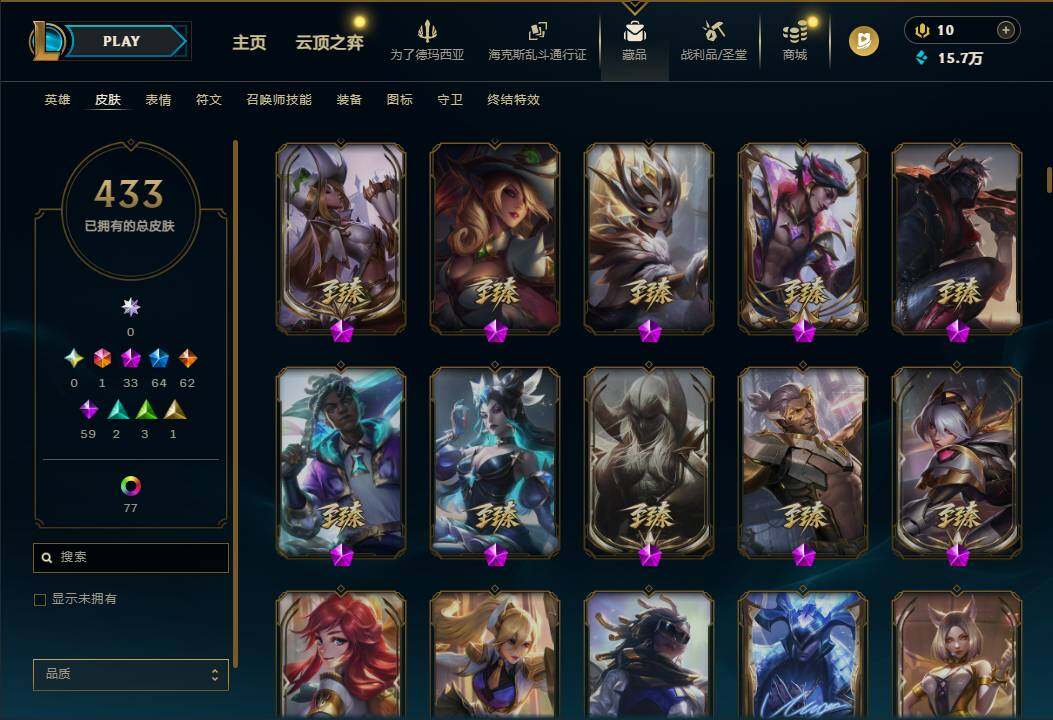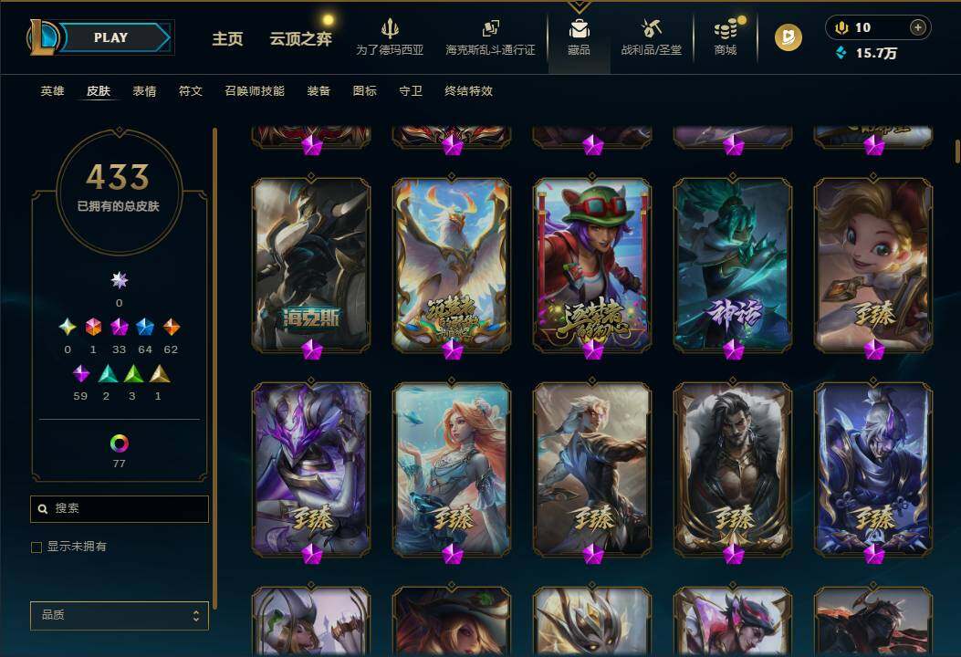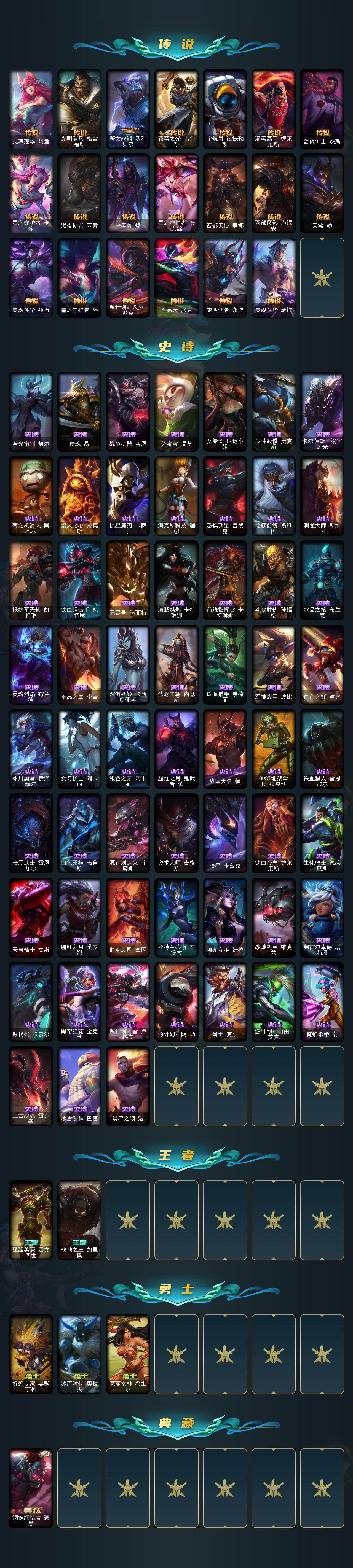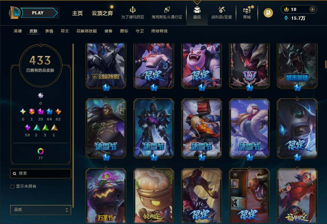 172英雄/433皮肤/1终极/33神话/64限定/19臻彩/217炫彩/62传说/59史诗/未定级账号等级:283/