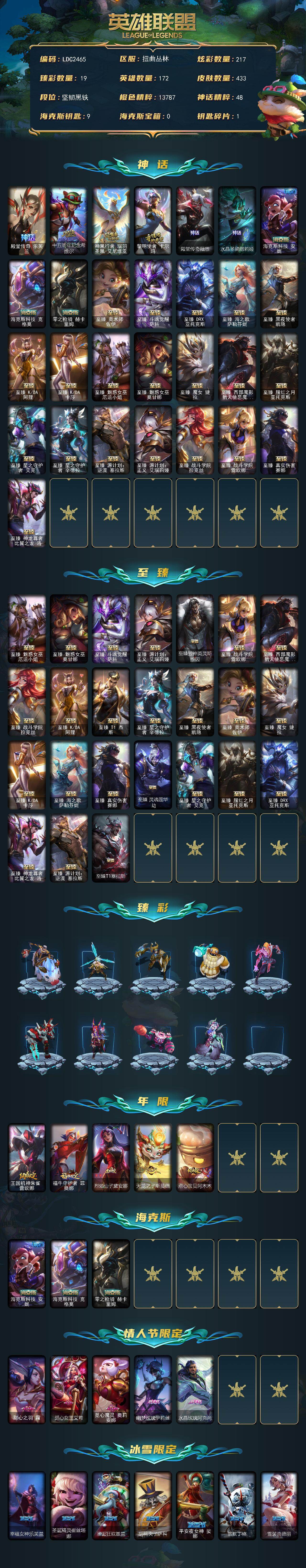 【LDC2465】172英雄/433皮肤/1终极/33神话/64限定/19臻彩/217炫彩/62传说/59史诗/未定级账号等级:283/殿堂传奇乐芙兰/十五周年纪念希维尔/神凰行者瑞羽圣凰艾尼维亚/黎明使者卡尔玛/殿堂传奇薇恩/水晶圣骑塔莉娅/海克斯科技安妮/海克斯科技克格莫/零之枪骑赫卡里姆/至臻真实伤害赛娜/至臻神龙尊者比翼之龙洛/至臻奥术师佐伊/至臻斗魂觉醒萨科/至臻DRX亚托克斯/至臻海之歌萨勒芬妮/至臻黑夜使者凯隐/至臻KDA阿狸/至臻KDA卡莎/至臻魅惑女巫厄运小姐/至臻魅惑女巫莫甘