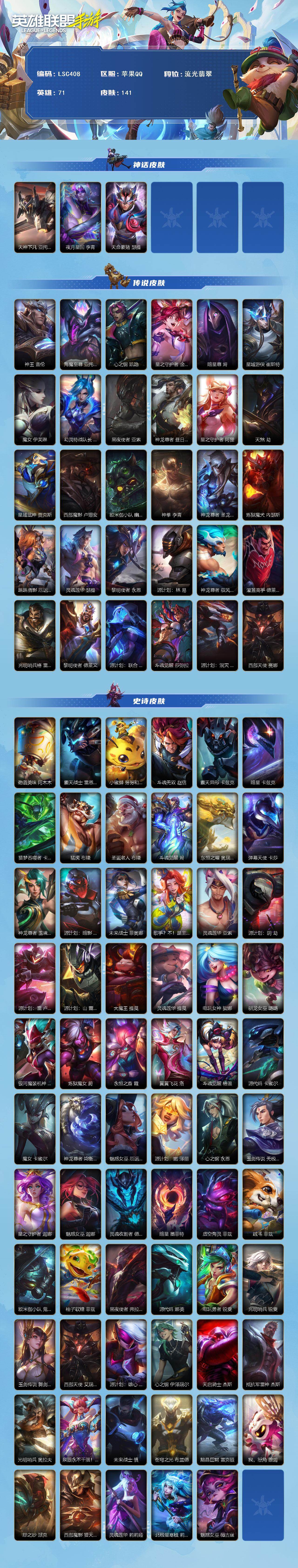 【LSC408】71英雄/141皮肤/流光翡翠/夜月星回 李青/天命豪赌 瑟提/天神下凡 亚托克斯/神王 盖伦/海魔至尊 亚托克斯/心之钢 凯隐/星之守护者 金克丝/暗星尊 烬/星域游侠 崔斯特/魔女 伊芙琳/幻灵特战队长 菲奥娜/黑夜使者 亚索/神龙尊者 昼日真龙 亚索/星之守护者 阿狸/天煞 劫/星域武神 贾克斯/西部魔影 卢锡安/欧米伽小队 幽灵特工 提莫/神拳 李青/神龙尊者 圣龙 李青/炼狱魔犬 内瑟斯/跳跳倩影 厄运小姐/灵魂莲华 瑟提/黎明使者 永恩/源计划:林 易/神龙尊者 驭风