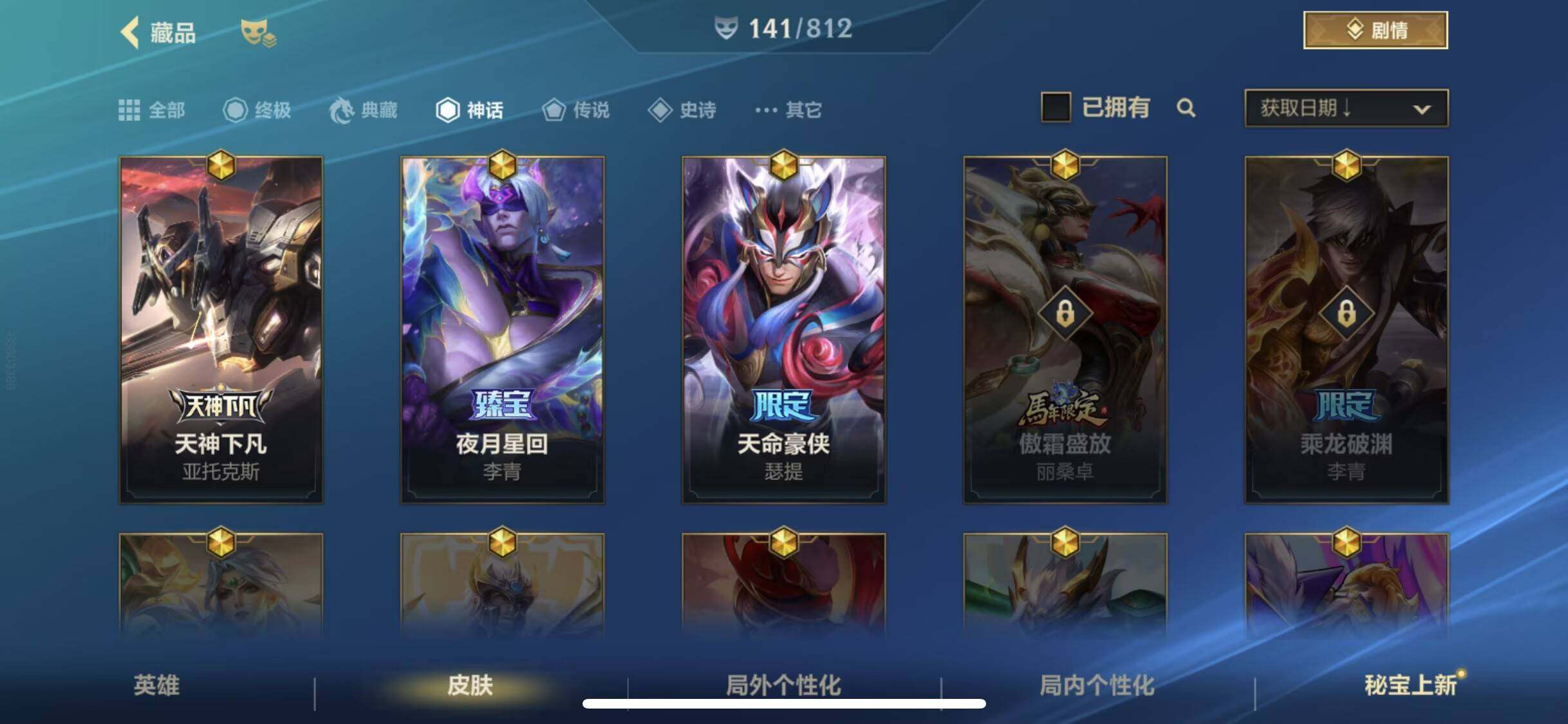 71英雄/141皮肤/流光翡翠/夜月星回 李青/天命豪赌 瑟提/天神下凡 亚托克斯/神王 盖伦/