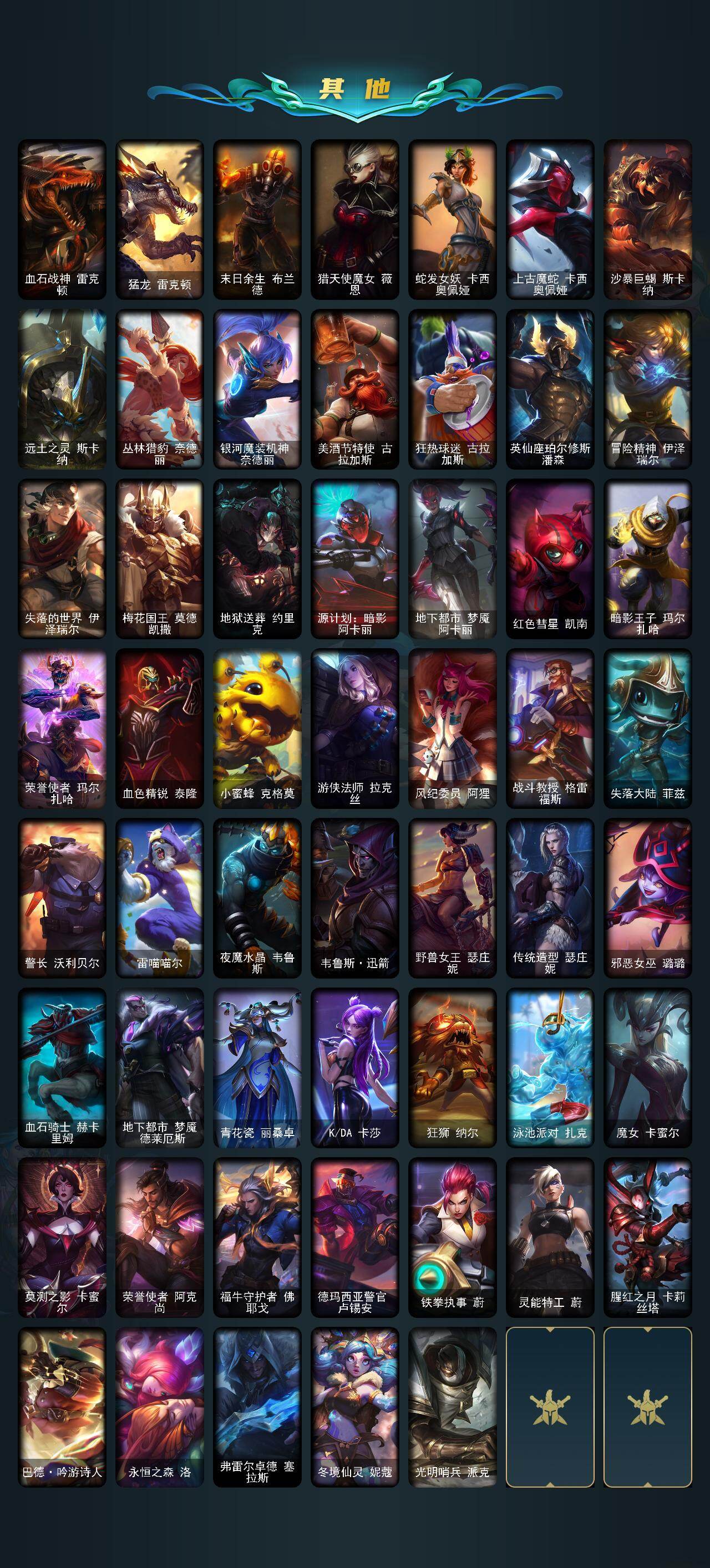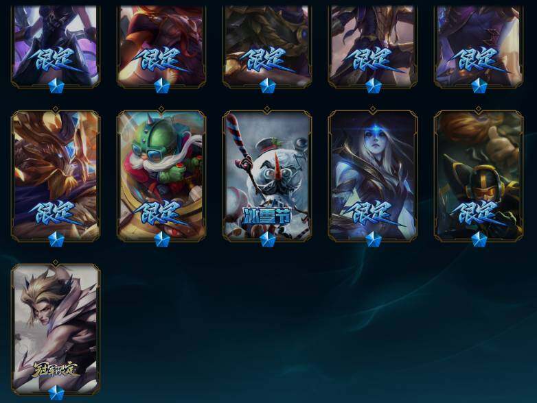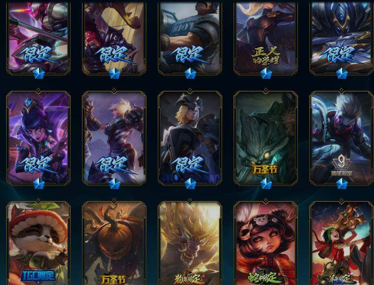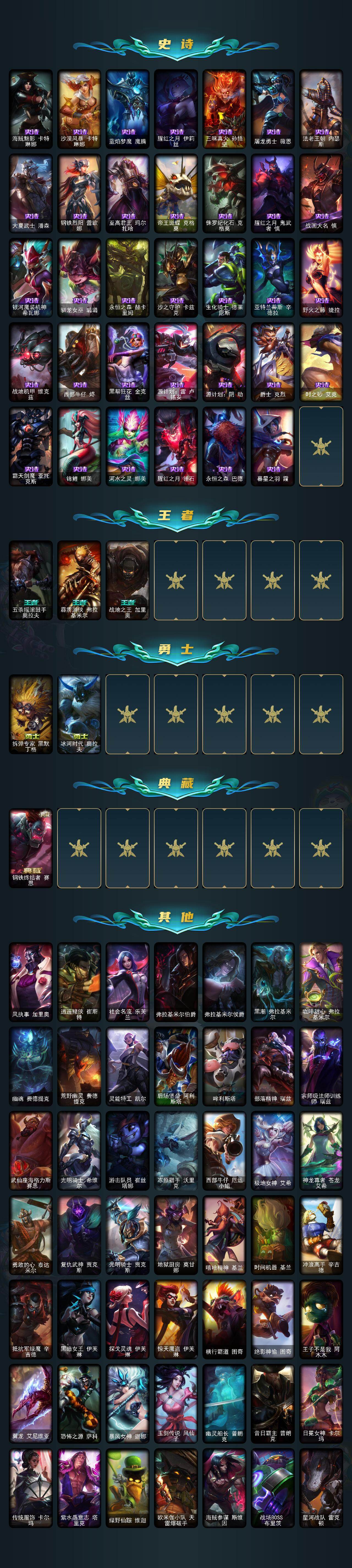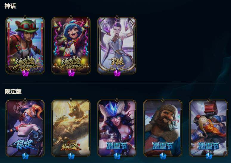 172英雄/223皮肤/3神话/31限定/43炫彩/24传说/55史诗/钻石/十周年纪念安妮/十五周年纪念希维尔/