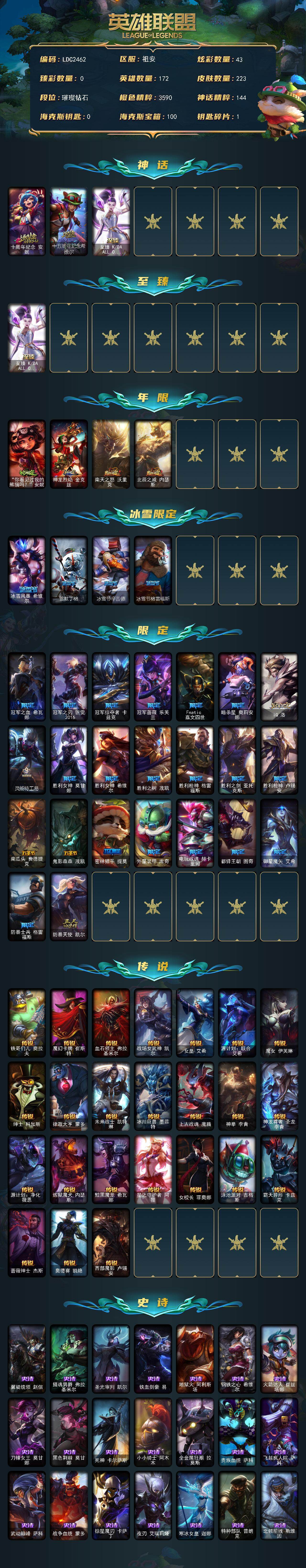 【LDC2462】172英雄/223皮肤/3神话/31限定/43炫彩/24传说/55史诗/钻石/十周年纪念安妮/十五周年纪念希维尔/至臻KDAALLOUT卡莎/你看见过我的熊猫吗安妮/神龙烈焰金克丝/南天之怒沃里克/北辰之威内瑟斯/冰雪风暴希维尔/雪默丁格/冰雪节辛吉德/冰雪节格雷福斯/冠军之血希瓦娜/冠军之刃锐雯2016/冠军掠夺者卡兹克/冠军蔷薇乐芙兰/Fnatic嘉文四世/暗杀星奥莉安娜/iG洛/灵能特工易/胜利女神莫甘娜/胜利女神希维尔/胜利之树茂凯/胜利枪神格雷福斯/胜利之剑亚托克斯/