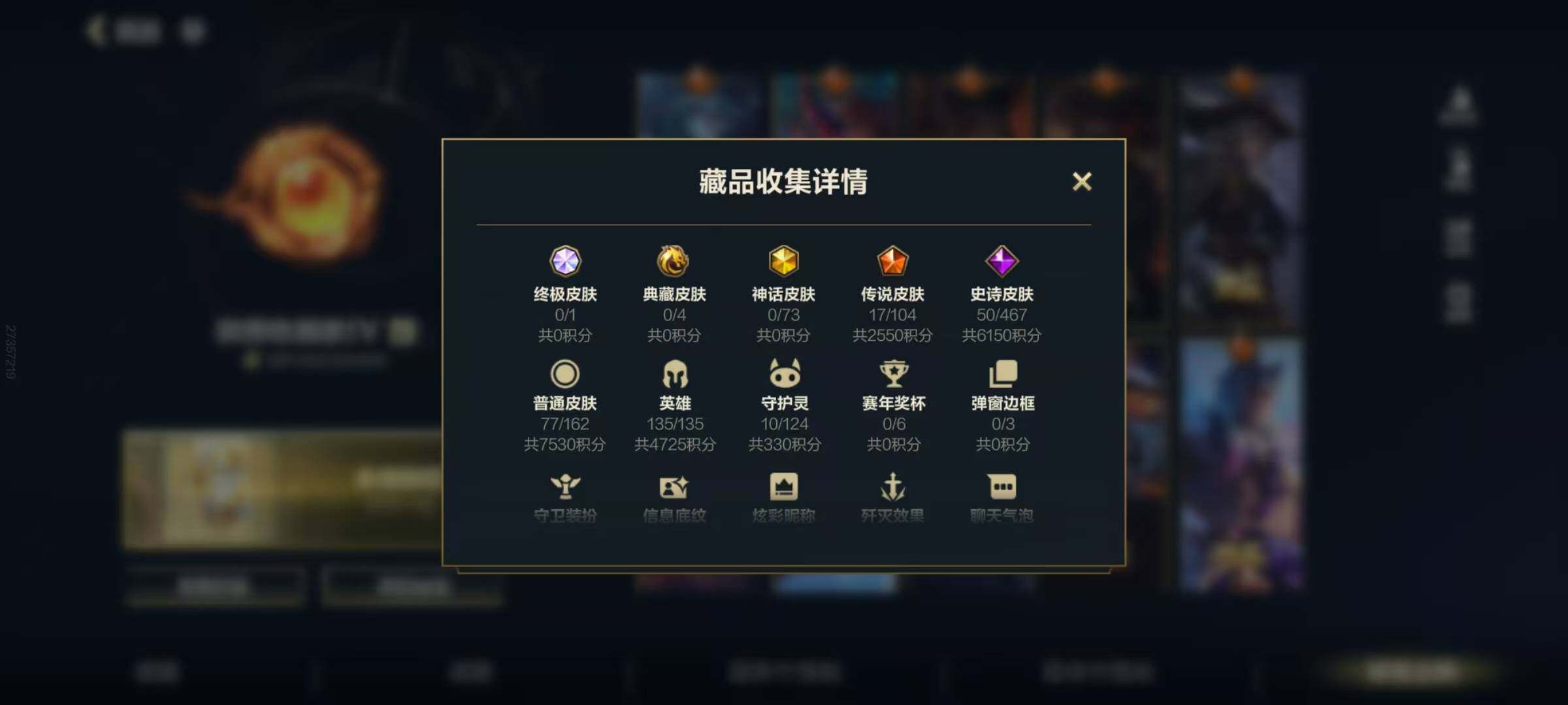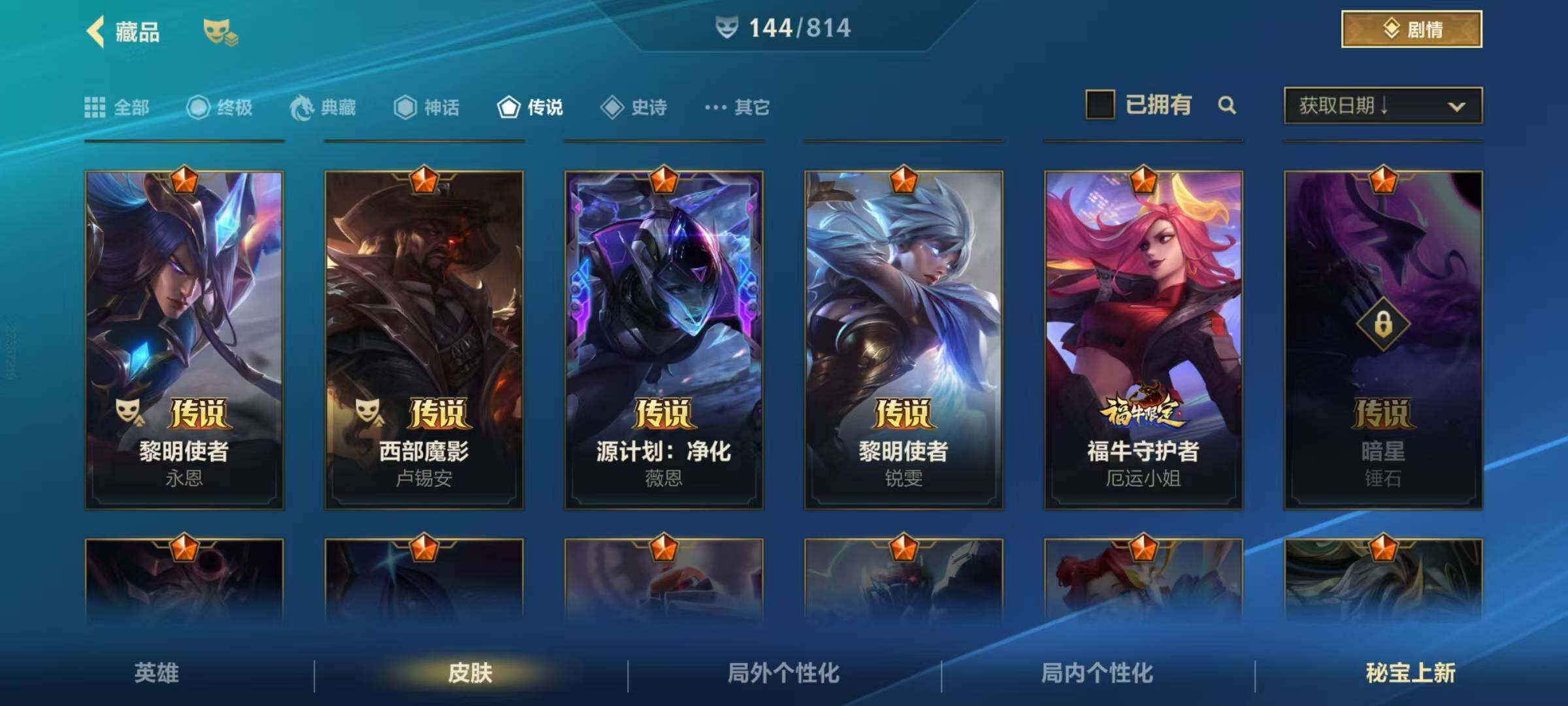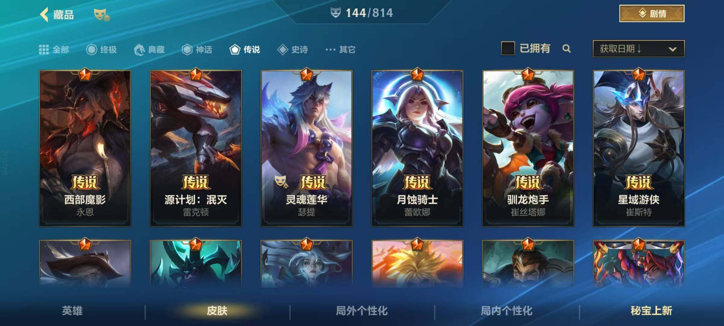 135英雄/144皮肤/17传说/华贵铂金/源计划:净化 薇恩/北极星神 黛安娜/星域游侠 崔斯特/西部魔影 卢锡安/