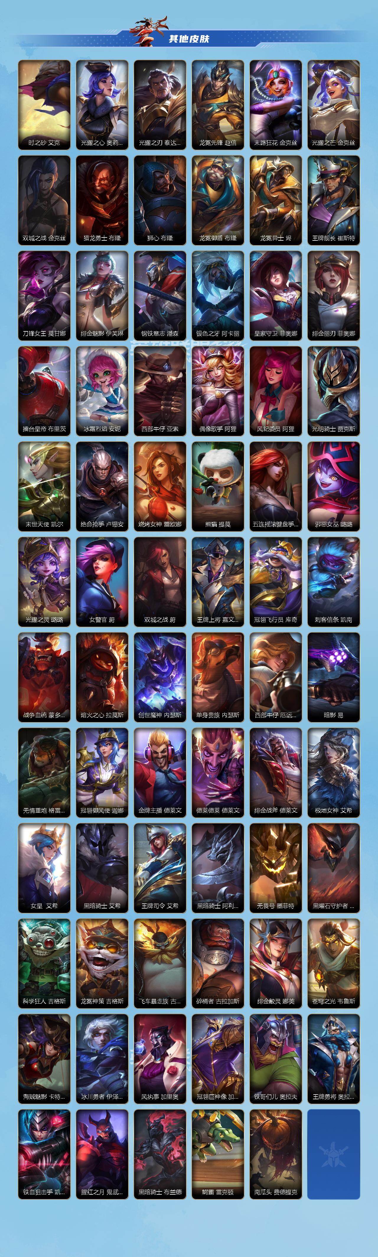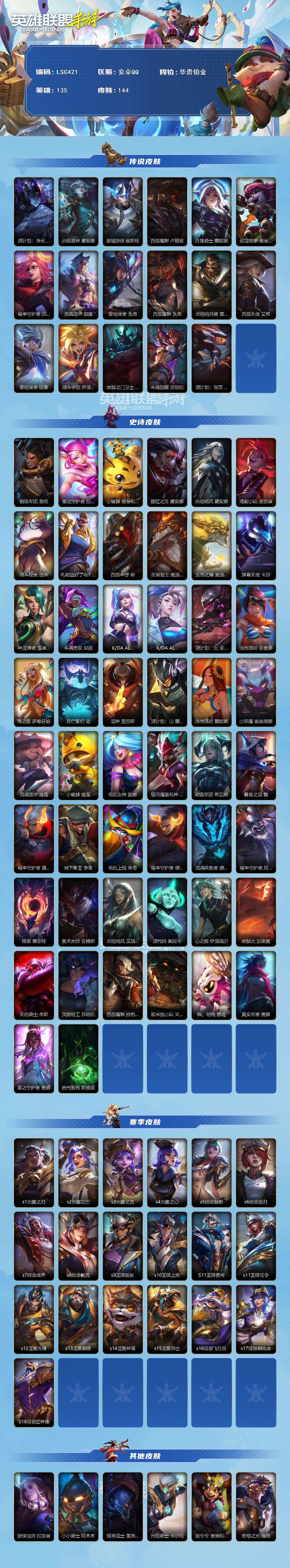 【LSC421】135英雄/144皮肤/17传说/华贵铂金/源计划:净化 薇恩/北极星神 黛安娜/星域游侠 崔斯特/西部魔影 卢锡安/月蚀骑士 蕾欧娜/驯龙炮手 崔丝塔娜/福牛守护者 厄运小姐/灵魂莲华 瑟提/黎明使者 永恩/西部魔影 永恩/光明哨兵 格雷福斯/西部天使 艾希/黎明使者 锐雯/战斗学院 伊泽瑞尔/地狱之门卫士 加里奥/斗魂觉醒 莎弥拉/源计划:泯灭 雷克顿/钢铁军团 盖伦/星之守护者 拉克丝/小蜜蜂 努努和威朗普/腥红之月 黛安娜/光明哨兵 黛安娜/清剿小队 金克丝/战斗校长 悠